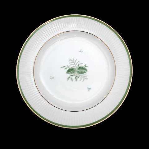 Royal Copenhagen, Grøn Melodi designet af Thorkild Olsen i 1950'erne. Hvidt riflet stel med guldkant og motiver i grønt. Aflangt fad. Nr. 1513/14055. Længde 27,7 cm. Diameter 19 cm. I. sortering. Pris: 375 kr. Lager: 1