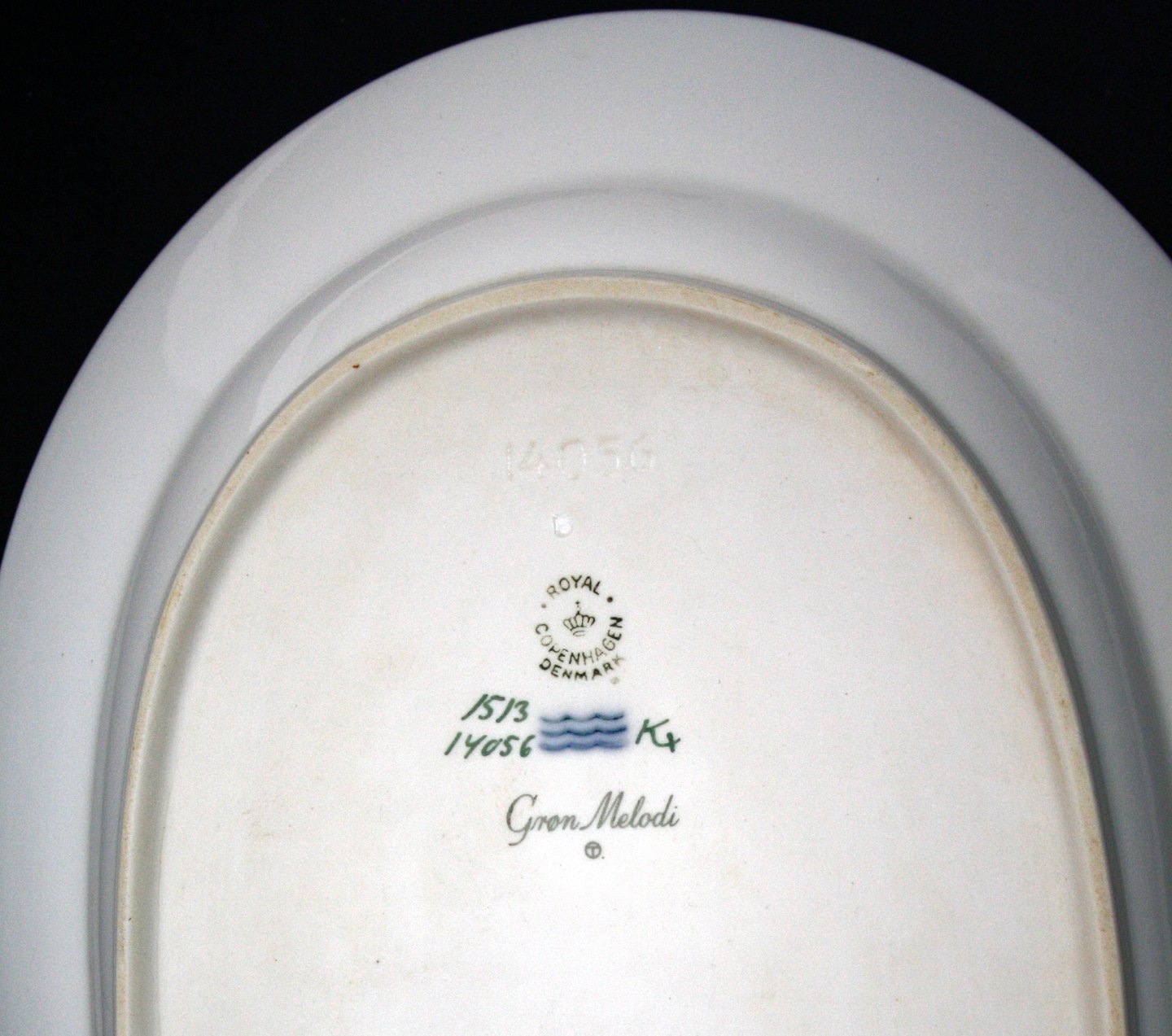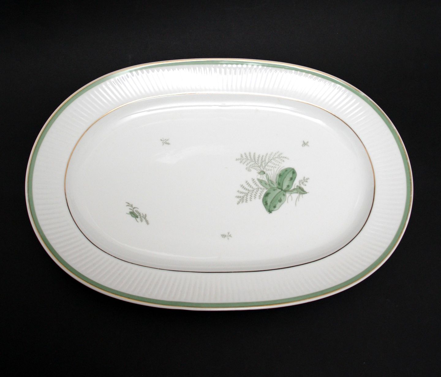 Royal Copenhagen, Grøn Melodi designet af Thorkild Olsen i 1950'erne. Hvidt riflet stel med guldkant og motiver i grønt. Aflangt fad. Nr. 1513/14056. Længde 32,7 cm. Diameter 22,4 cm. I. sortering med lettere brugsslid på grøn kant og guldkant. Pris: 375 kr. Lager: 1