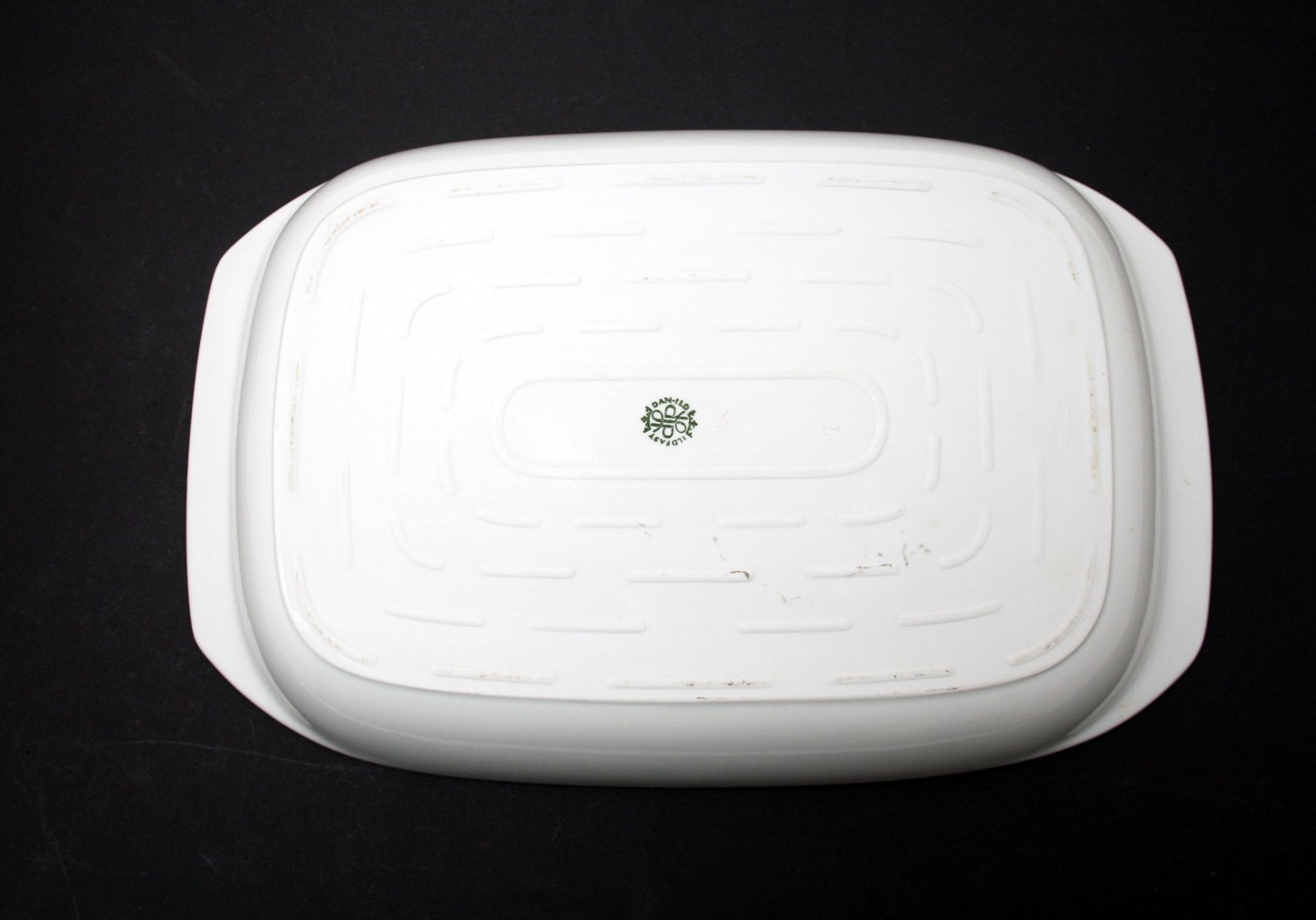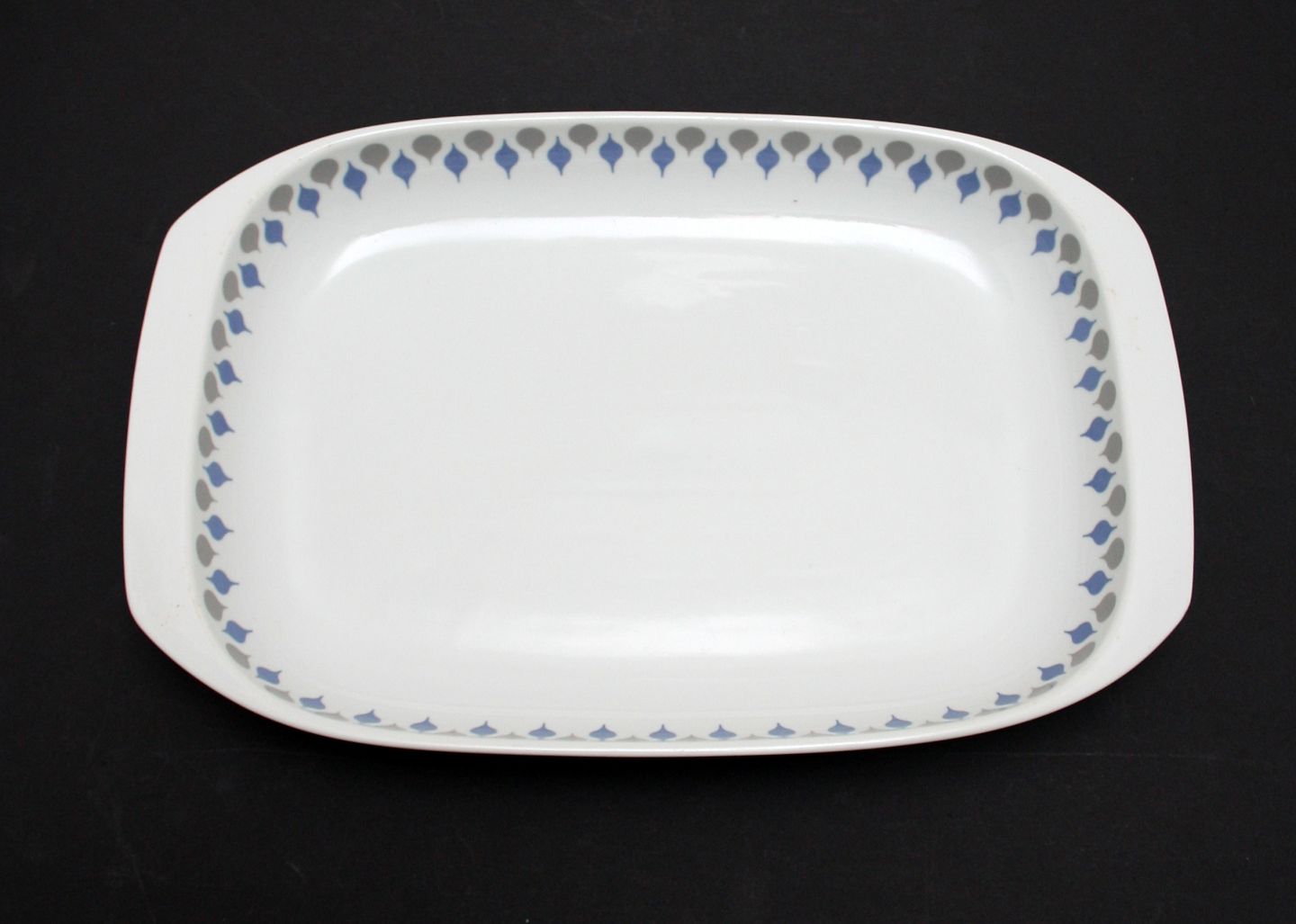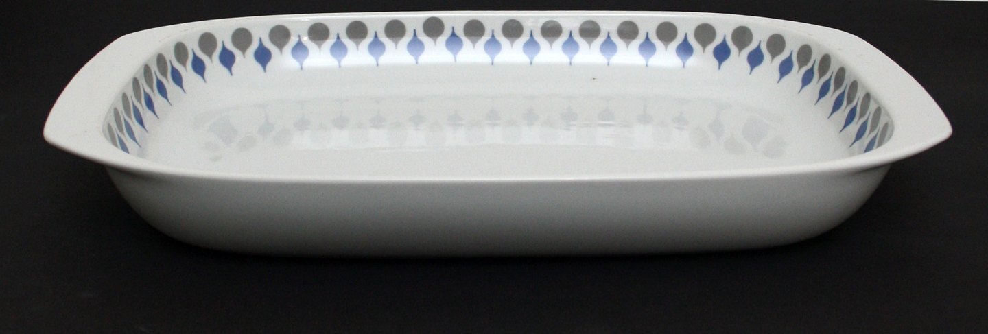 Lyngby porcelænsfabrik, Danild 66 designet af Axel Brüeli 1950'erne. Stort gratin stegefad. Længde 37 cm. Højde 4,5 cm. Bredde 24 cm. Flot stand. Pris: 375 kr. stk. Lager: 2