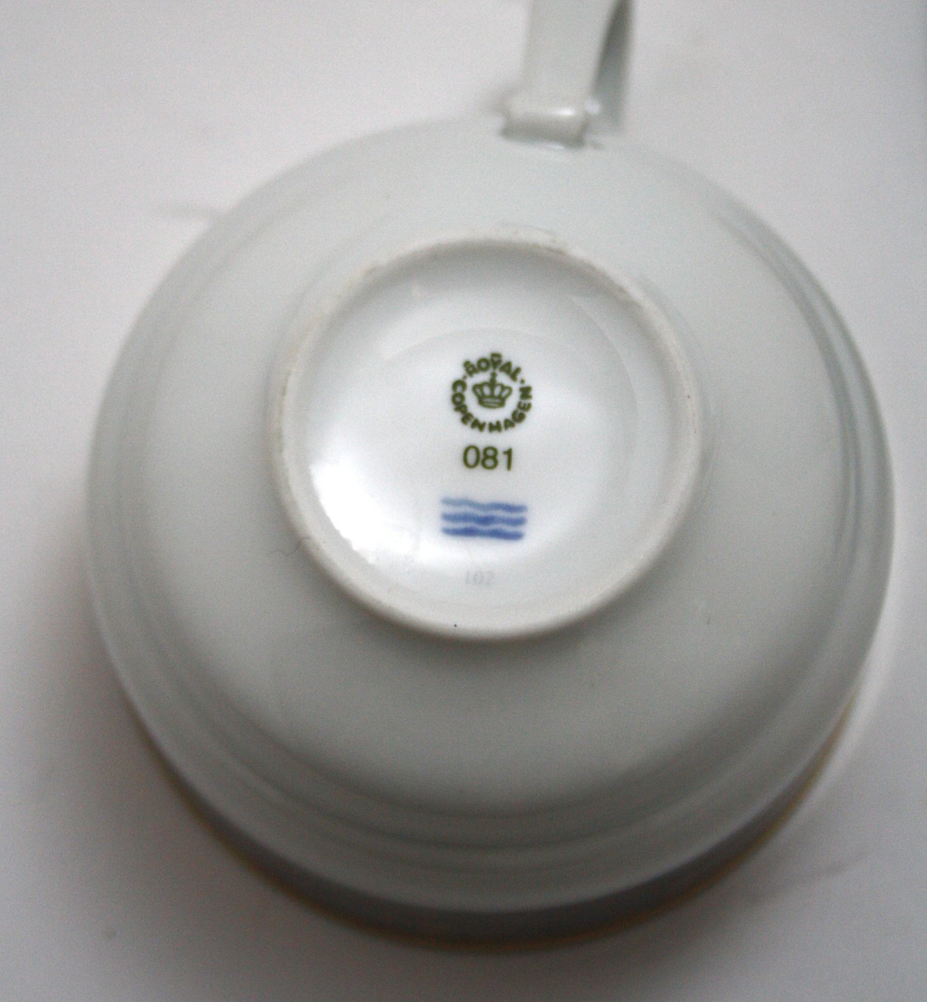 Tekop nr. 081. Højde 5,5 cm. Diameter 8,5 cm. Underkop nr. 073. Diameter 14,5 cm. I. sortering. Perfekt stand. Pris: 150 kr. stk. Lager: 6