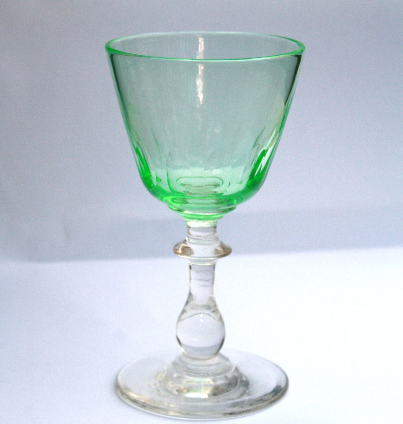 Holmegaard, Mathilde, Hvidvin neongrøn med oliveslibning. Kalkformet kumme på balusterformet massiv stilk, Holmegaard glasværk 1900-1931. Højde ca. 11,8 cm. Diameter 6,5 cm. Fin stand. Pris: 150 kr. stk. Lager: 7