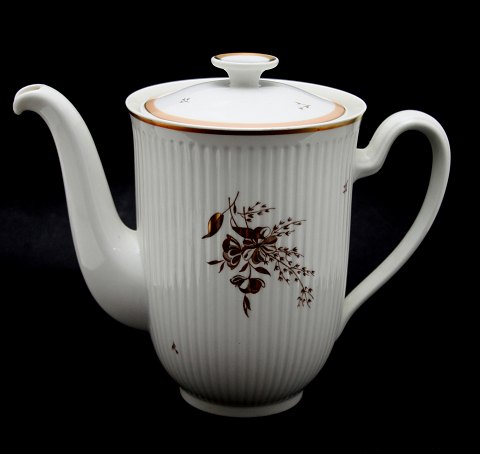 Royal Copenhagen, Clarissa. Designet af Thorkild Olsen i 1950'erne. Hvidt riflet stel med guld- og rosa/beige kanter, samt blomstermotiv i guld. Kaffekop. Nr. 1510/9956. Højde 6,4 cm. Diameter 7,5 cm. Underkop diameter 13,5 cm. II. sortering. Fin stand. Pris: 40 kr. pr. par Lager: 11