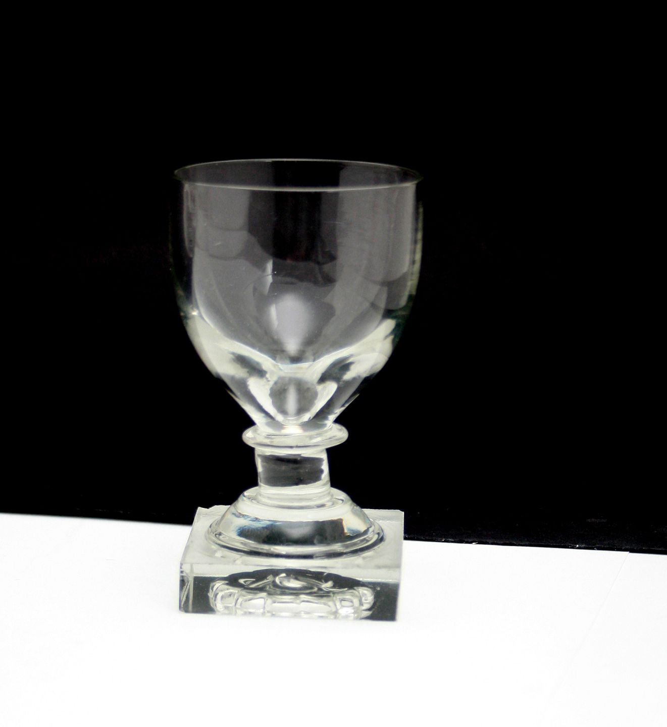 Holmegaard glasværk, Gorm den Gamle/Viking glas med kraftig firkantet slebet fod. Bunden har opstukket "blomst" med runde kronblade. Ikke planslebet på toppen af fod. Portvin. Højde 9 cm. Diameter 5,2 cm. Minimale afslag i bunden af fod. Fin stand. Pris: 125 kr. stk. Lager: 4