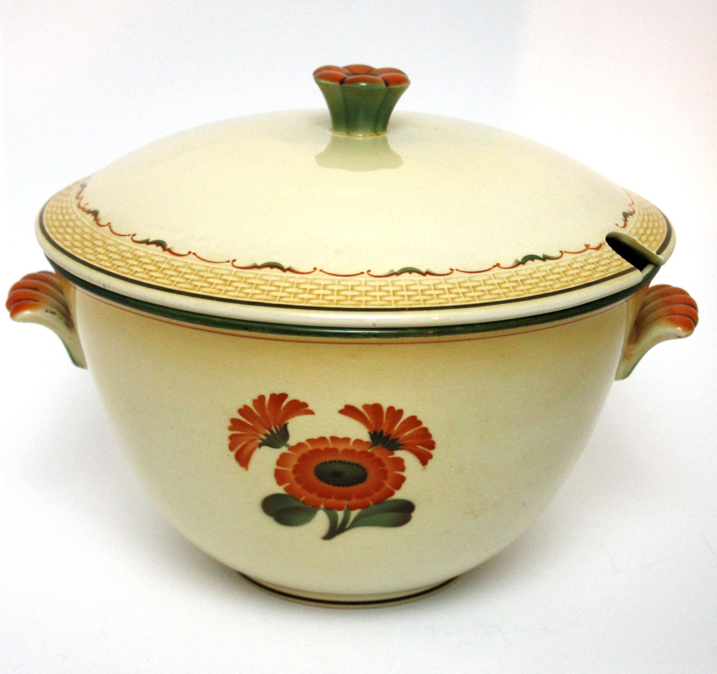 Aluminia, Morgenfrue. Designet af Niels Thorsson. Produceret i perioden 1934-1967. Luftmalet. Suppeterrin med låg. Diameter 25 cm. Højde 21 cm. Fin stand. Pris: 375 kr. stk. Lager: 1