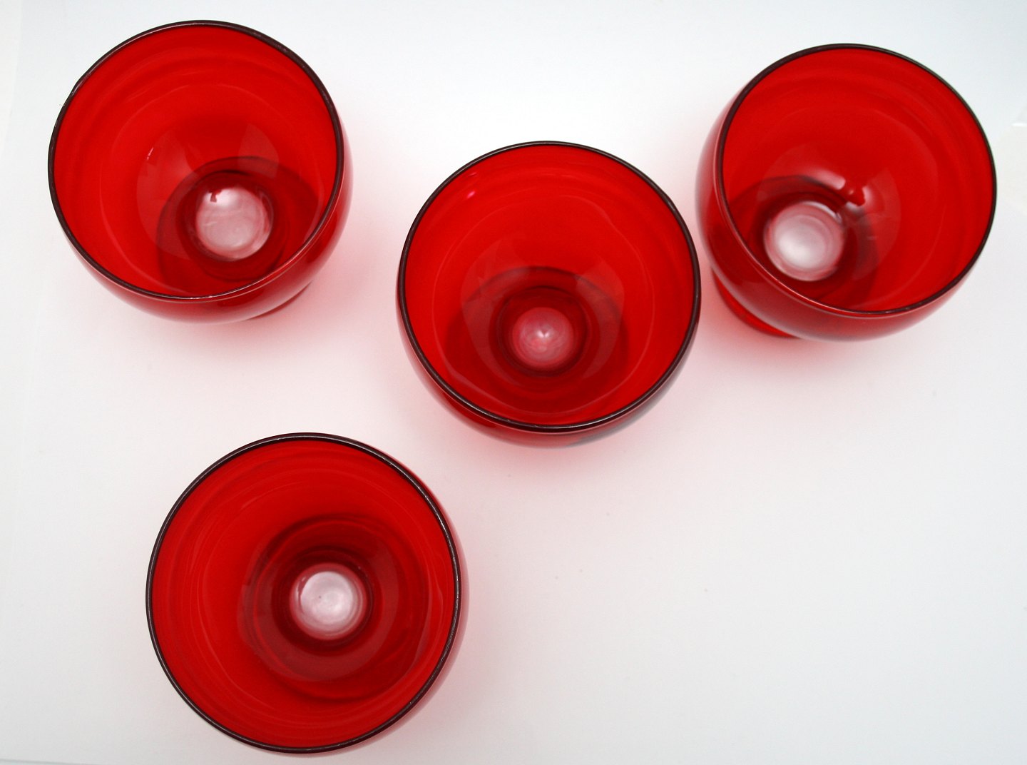 Flotte røde ballonglas med klar bund. Højde 10 cm. Øverste diameter 10 cm. Pris: 4 stk. 800 kr. sælges samlet.