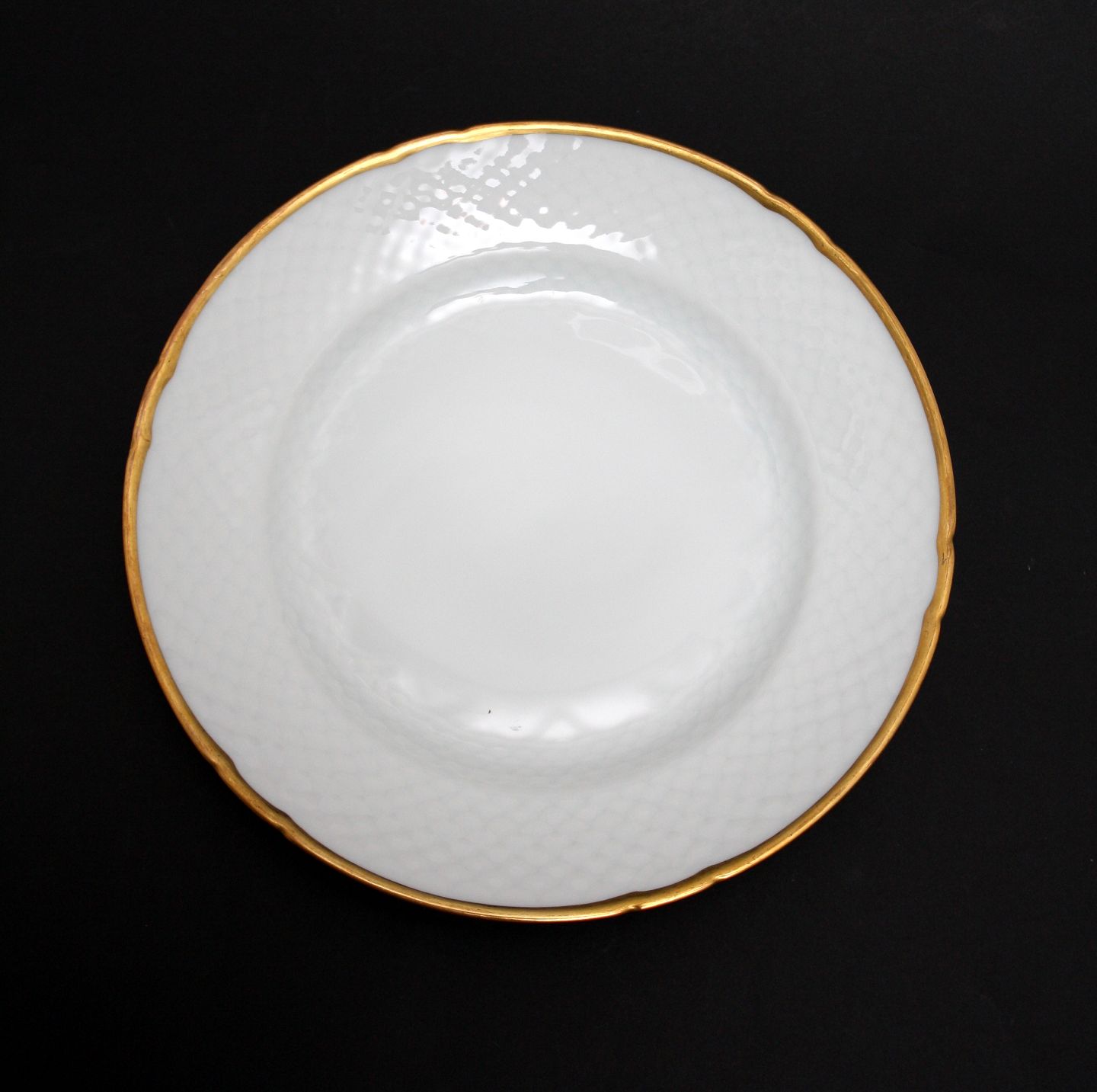Bing & Grøndahl, Aakjær hvid med guldkant. Flad frokosttallerken. Nr. 26. Diameter 21,5 cm. Pris: 100 kr. stk. Lager: 12