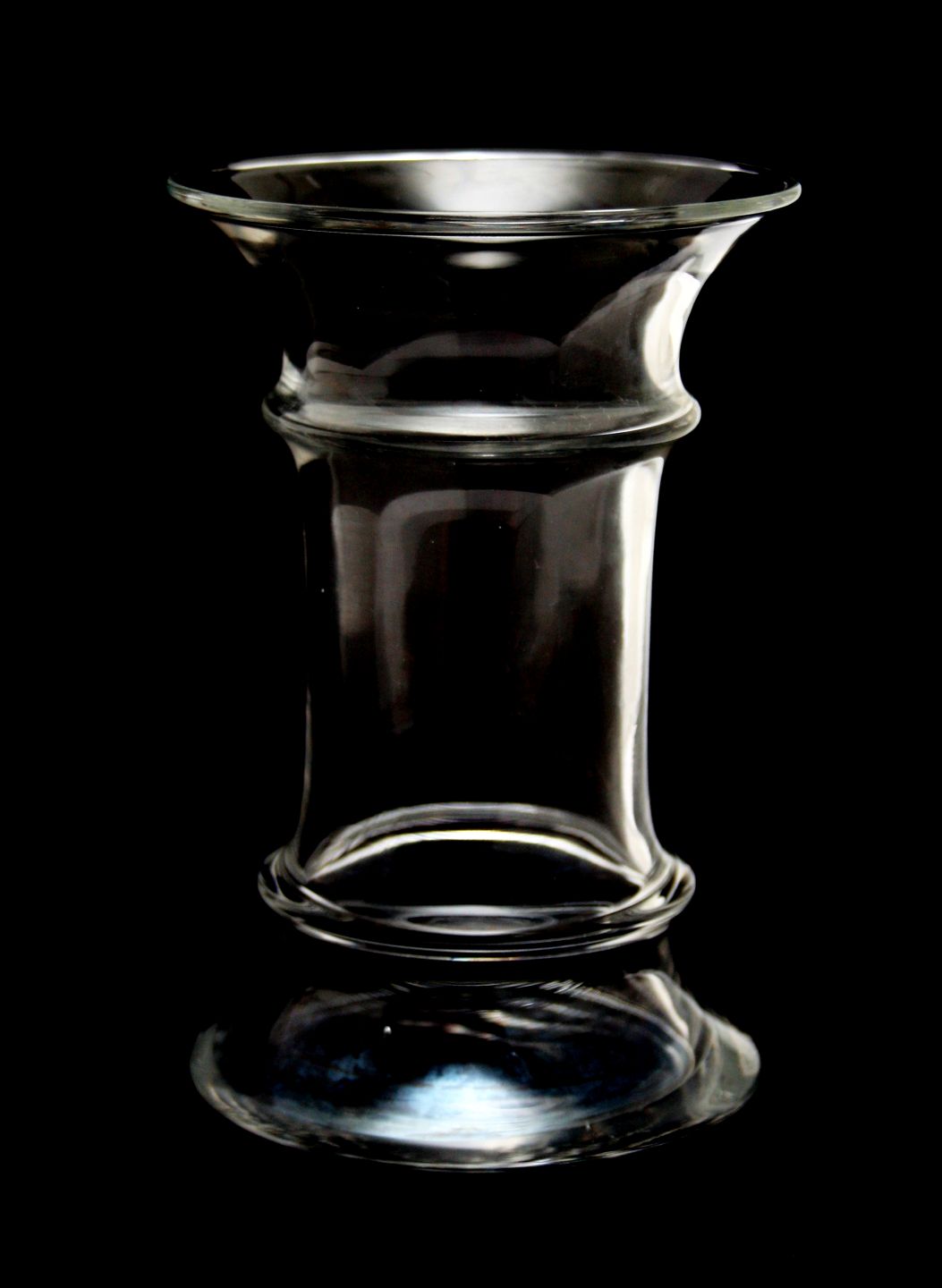 Holmegaard, MB serien designet af Michel Bang i 1981. Vase i formblæst klar glas. Der er ingen signatur i denne serie. Serien er mest kendt i hvid opal glas. Vase, højde 14 cm. Øverste diameter 9,5 cm. Pris: 175 kr. stk. Lager: 1