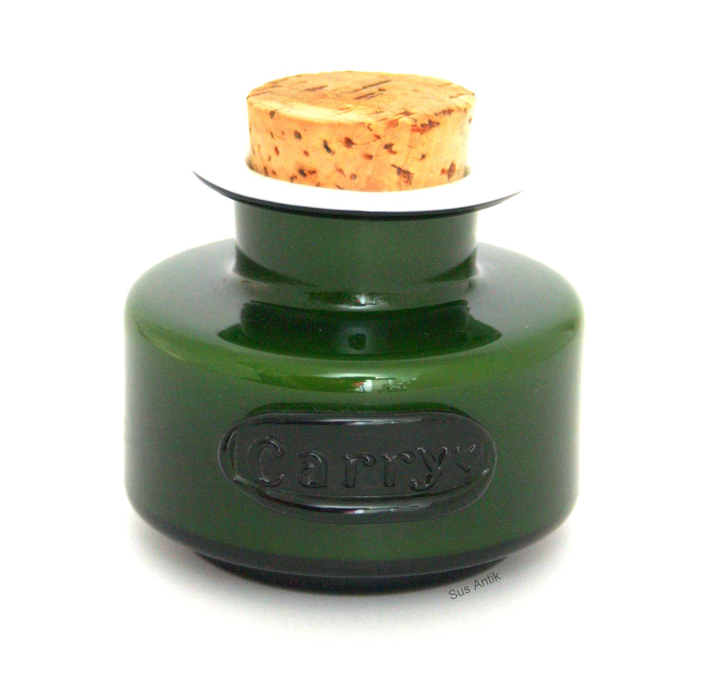 Holmegaard, Palet, Grøn køkkenserie, krydderikrukke med korkprop Carry. Designet af Michael Bang i 1970, udgår i 1976. Højde med prop ca. 8,5 cm. uden prop ca. 6,5 cm. Pris: 225 kr.