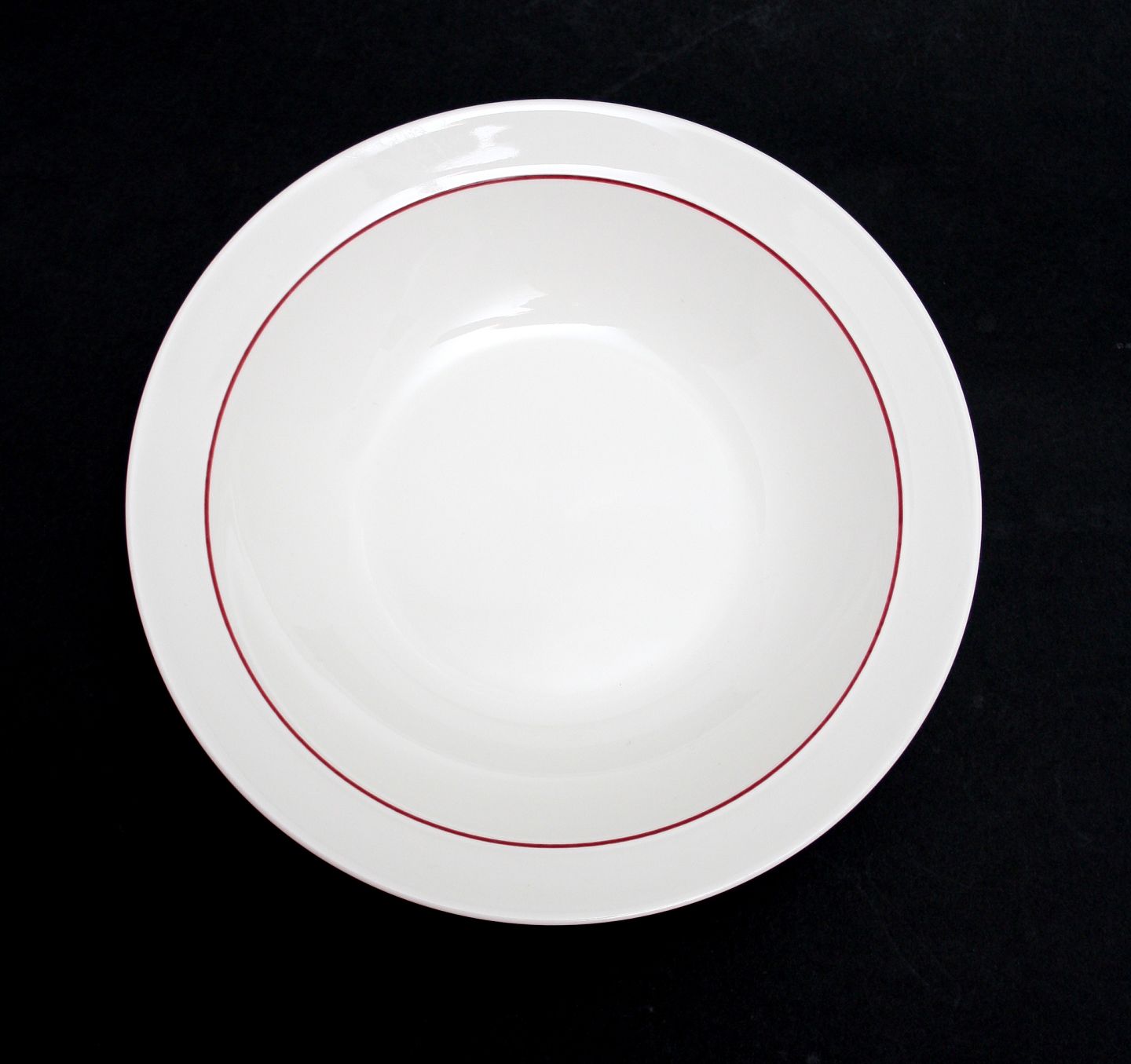 Arabia, Finland, Harlekin, rødhat. Creme tallerken med rød indvendig kantstribe. Designet af Inkeri Leivo i 1988. I produktion til 1993.