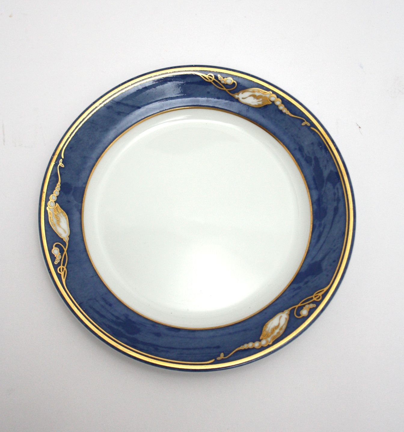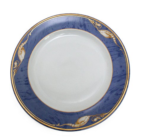 Royal Copenhagen, Blå Magnolia. Blå marmoreret bort dekoreret med gylden blomsterknop. Designet af Flemming Eskildsen. Lille kagetallerken Nr. 615. III. sortering, medarbejdersortering. Pris: 40 kr. stk. Lager: 5