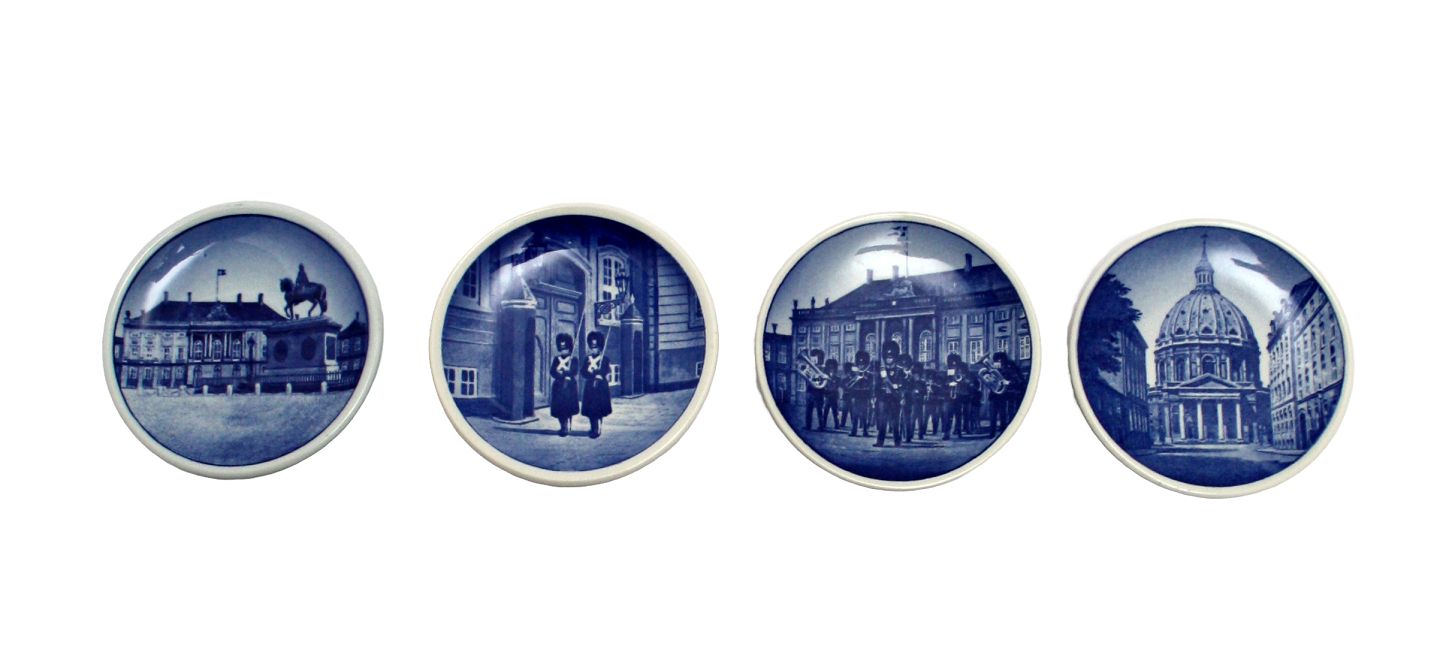 Aluminia/Royal Copenhagen 4 små plaketter. Amalienborg slot, Kongens Livgarde, Vagtparaden, Marmorkirken. Diameter 8 cm. Pris: Samlet for alle 4 200 kr.