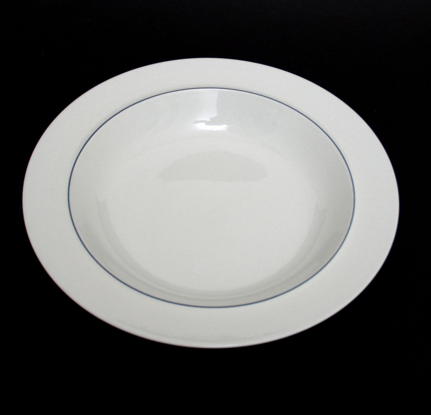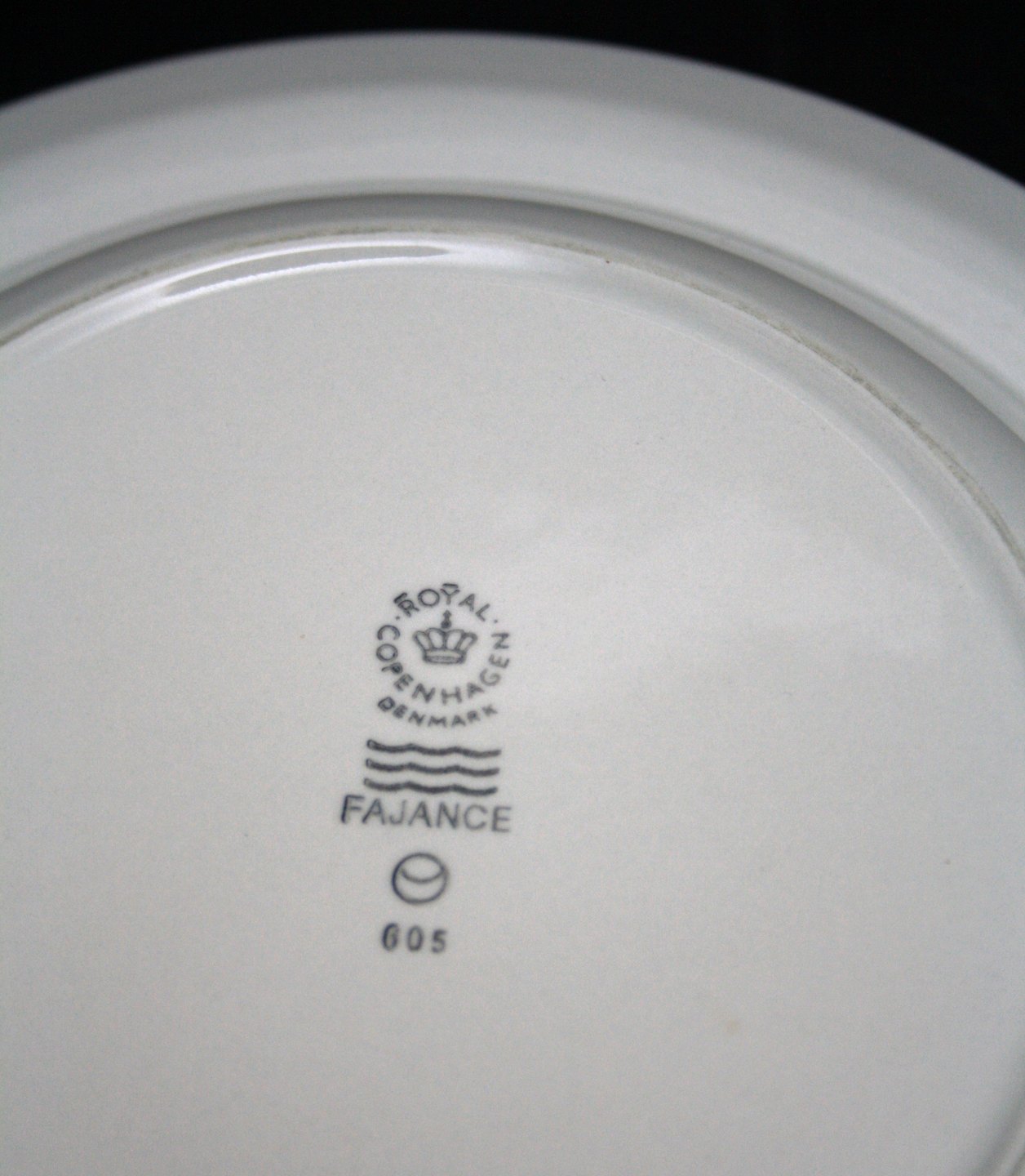 Royal Copenhagen fajance, Blåkant tidligere produceret under Aluminia. Designet af Grethe Meyer i 1965. Dyb middagstallerken. Nr. 605 og 3073. Diameter 24 cm. Almindeligt brugsslid. Pris: 150 kr. stk. Lager: 4