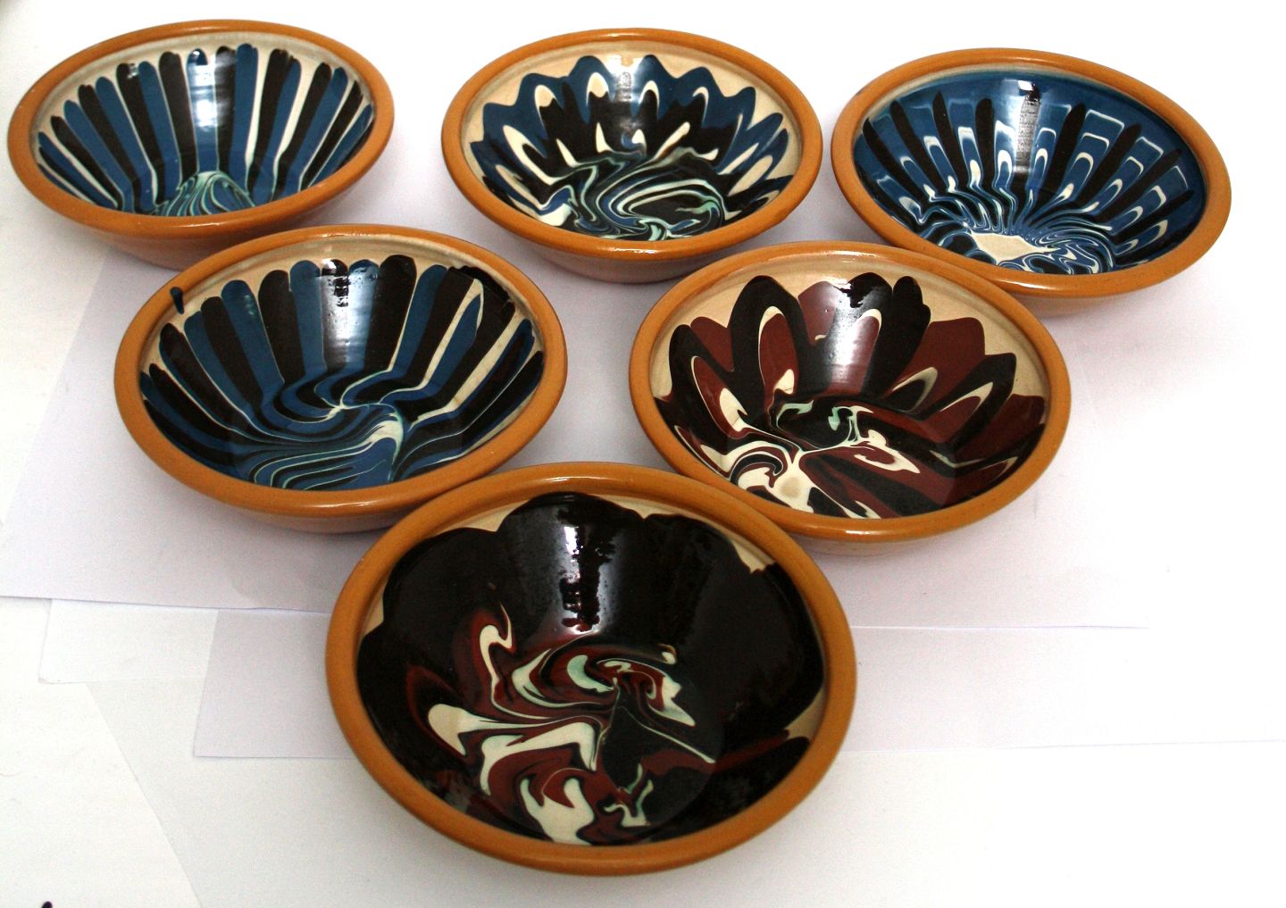 Abbednæs Potteri, Næstved. Skønne Grødskåle med blå og brune farver. Højde 5,5 cm. Øverste diameter 17 cm. Den ene brune har en revne i glasuren i bund, der ikke er gennemgående. Alle 6 skåle sælges samlet. Pris: 400 kr.