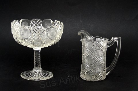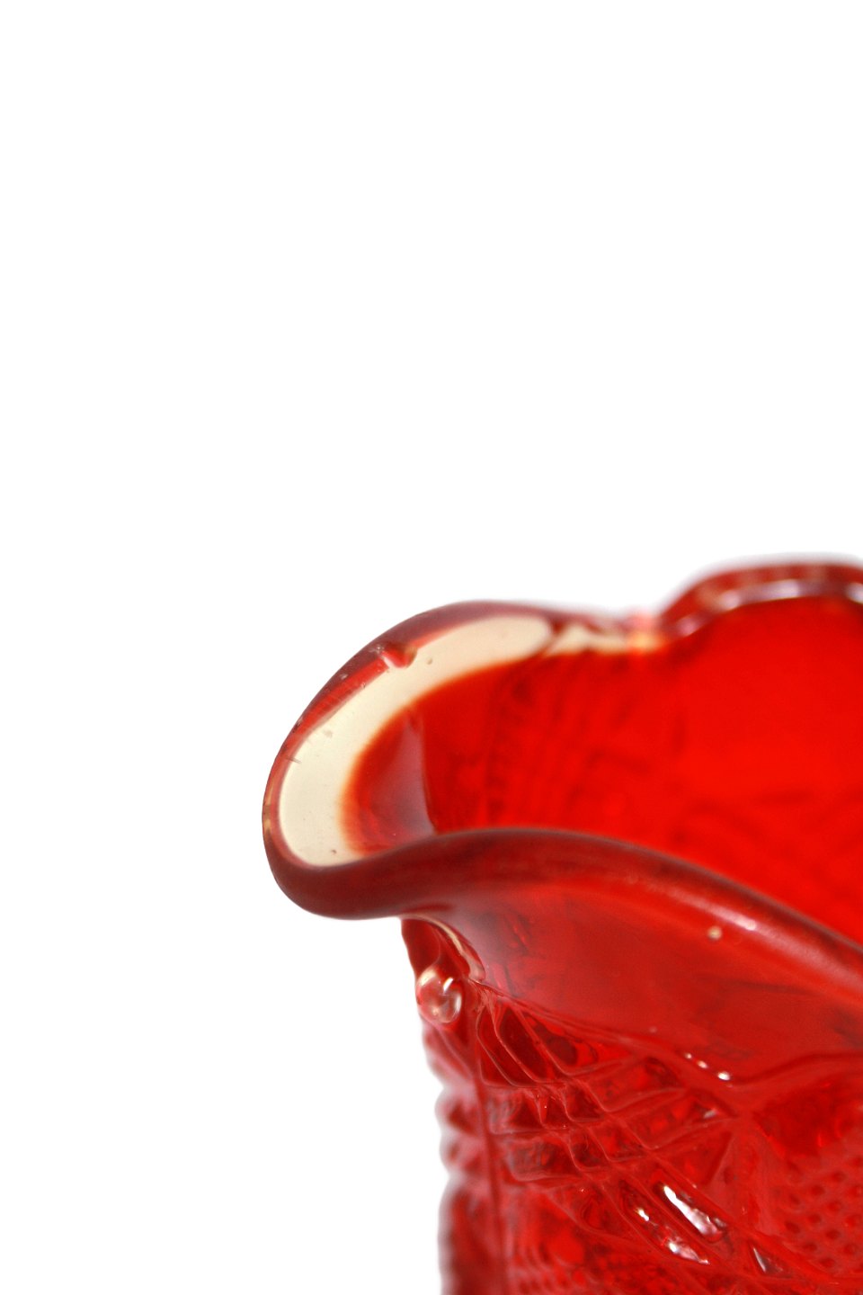 Fyens Glasværk, Sukkerstel i rødt ternet mønster i presset glas. Fyens Glasværk katalog 1924 nr. 196. Sukkerskål højde 13 cm. Diameter 11 cm. Flødekande højde 10,6. Lille flig/produktionsfejl på kanten. Fin stand. Pris: Sælges samlet 675 kr.