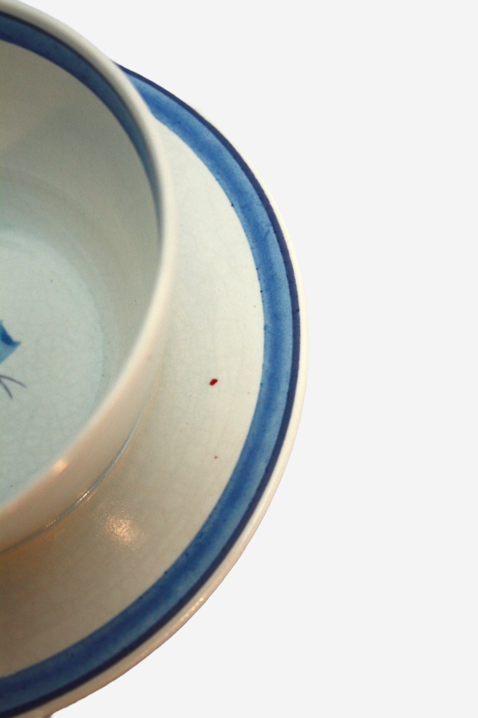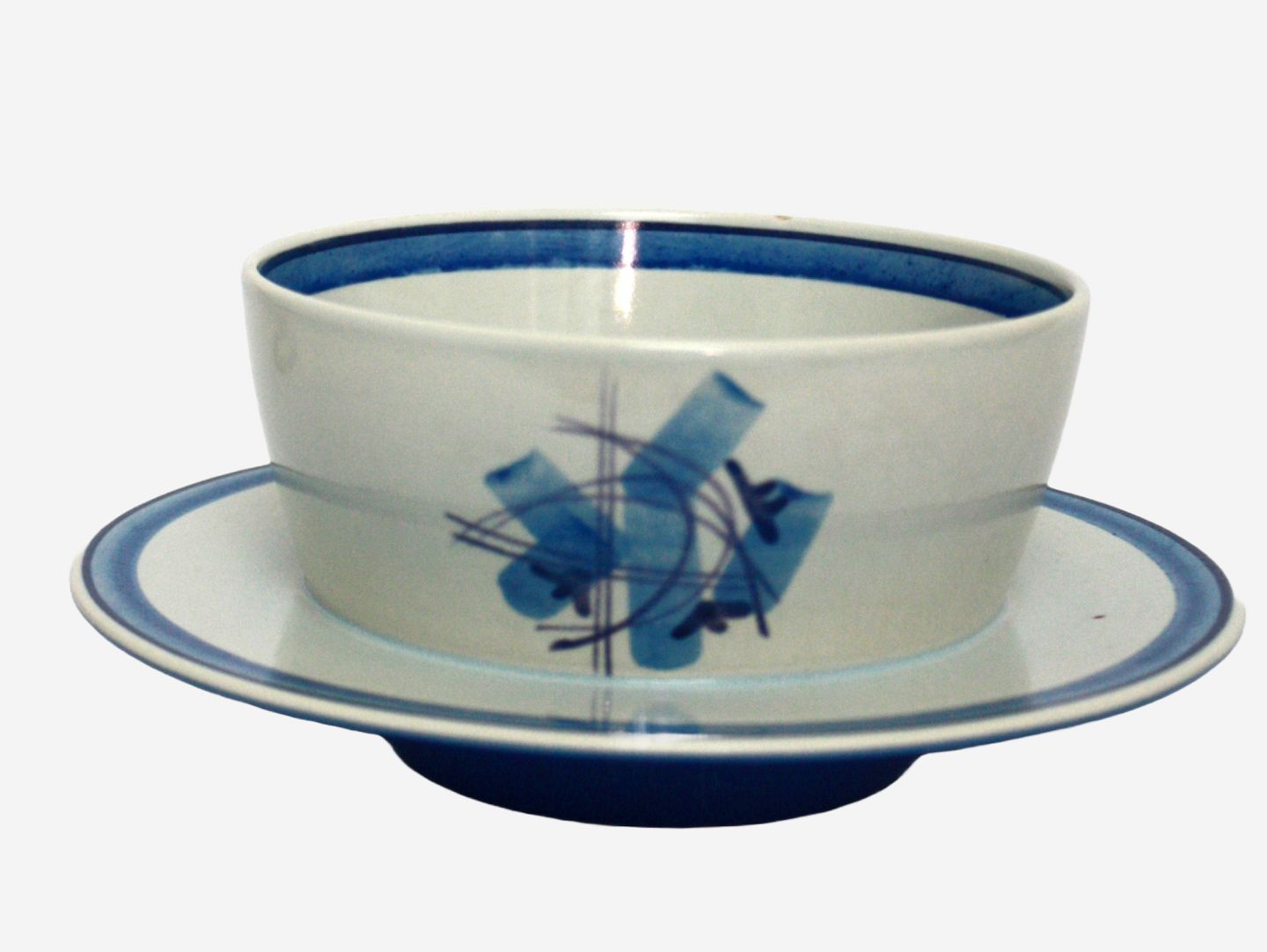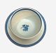 Aluminia, Camilla, Sovseskål med fast underfad. Designet af Nils Thorsson i 1959. Stellet var i produktion frem til 1967. Et af de mere sjældne stel. Højde 7,5 cm. Skål diameter 12,5 cm. Underfad diameter 19 cm. Lille glasurchip på kant. Lille rød prik på underfad ellers flot stand. Pris: 225 kr. stk. Lager: 1