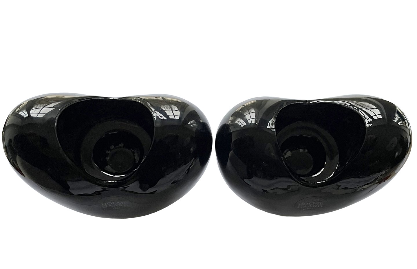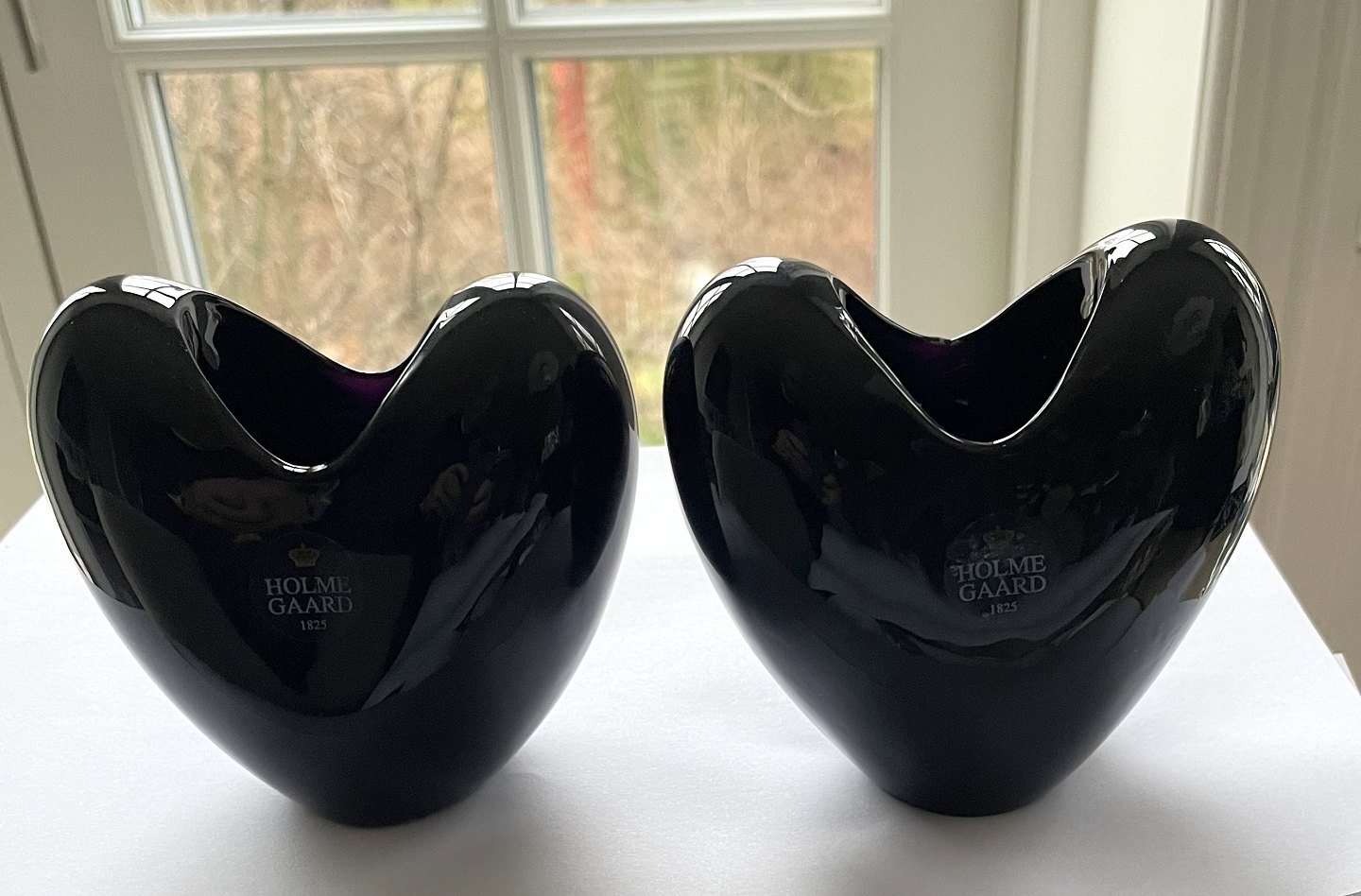 Holmegaard, Heart, sort lysestage til fyrfad og almindeligt lys. Designet af Anja Kjær i 2005. En del af Heart and Roses serien, som er slanke sokkel lysestager. Højde 10 cm. Længde 10 cm. Lidt brugsspor i form af småridser. Pris: 350 kr. for et sæt på 2