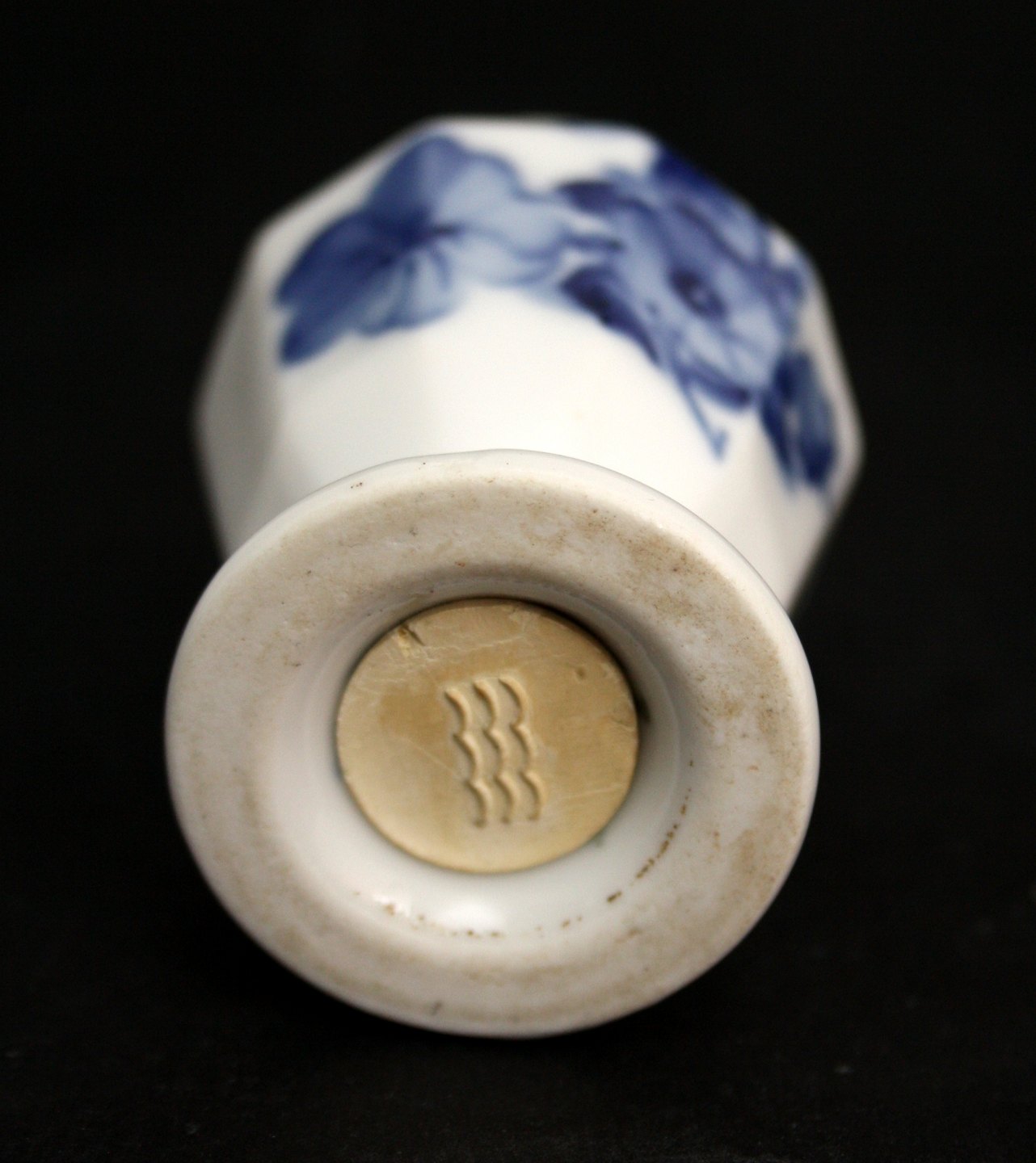 Royal Copenhagen, Blå Blomst kantet, Saltbøsse. Sjælden udgave da der er en blå knop i toppen, hvor der normalt er et S. Højde 8 cm. I. sortering. Leveres med original prop, men ny gummiprop kan tilkøbes for 20 kr. Pris: 200 kr. stk. Lager: 1