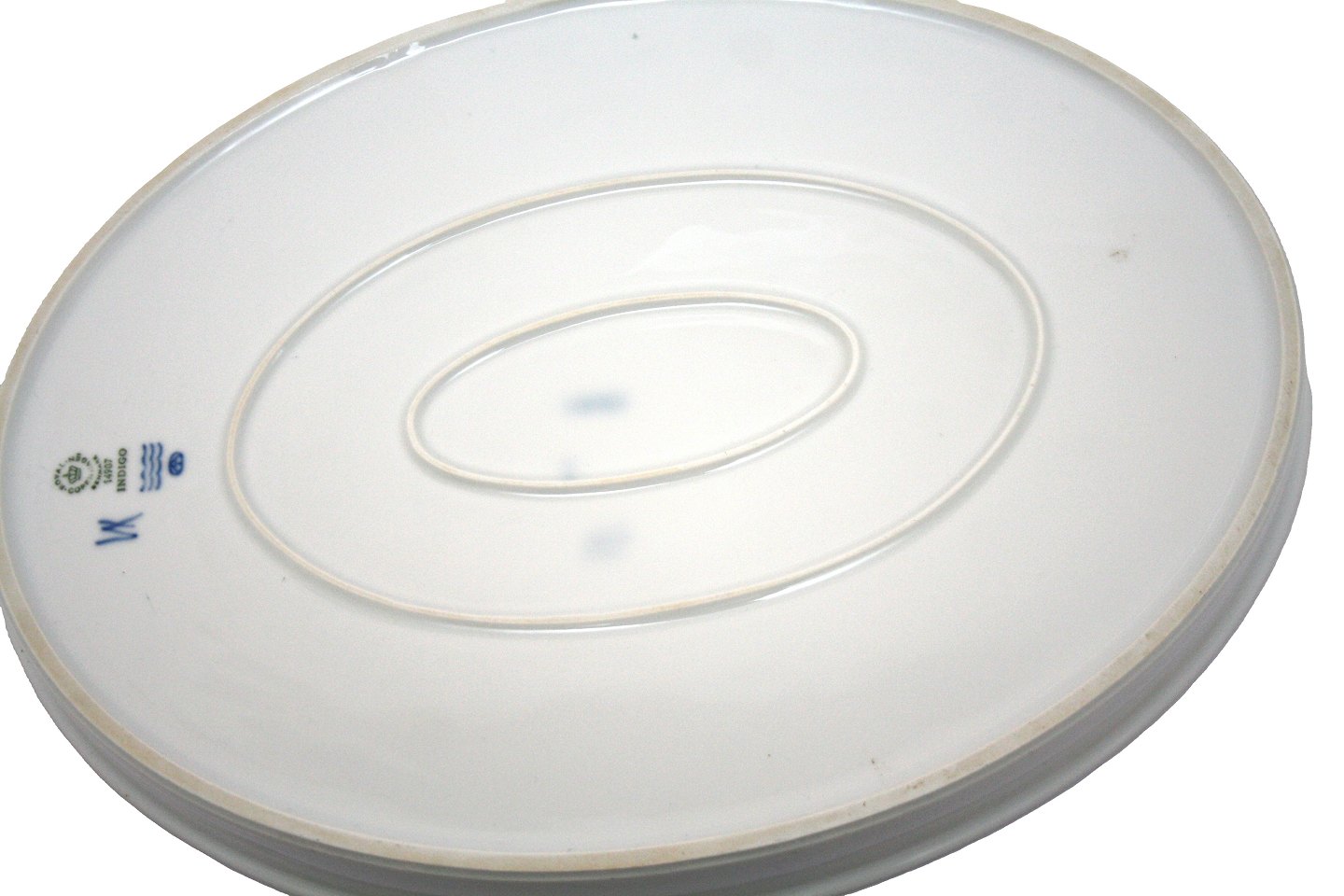 Royal Copenhagen, Indigo, Ovalt serveringsfad med kant eller bakke, hvidt porcelæn med indigoblå kant. Designet af Anne Marie Trolle i midten af 1970'erne, udgår i midten af 1980'erne. Nr. 14907. Højde 3,5 cm. Længde 35 cm. Bredde 26,5 cm. II. sortering, hvilket betyder at der kan være små produktionsfejl. Pris: 750 kr. stk. Lager: 1