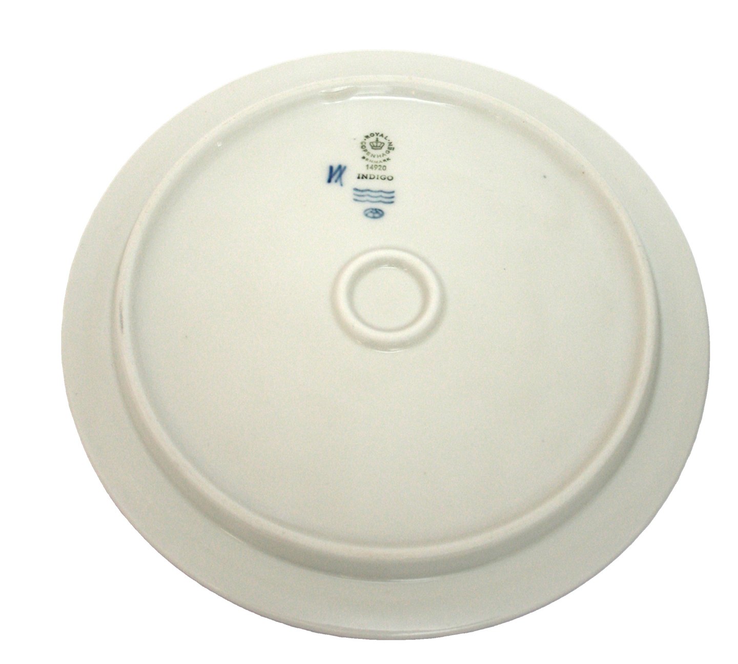 Royal Copenhagen, Indigo, Serveringsskål med låg,som også kan bruges som underfad. Hvidt porcelæn med indigoblå kant. Designet af Anne Marie Trolle i midten af 1970'erne, udgår i midten af 1980'erne. Nr. 14920. Højde med låg 8 cm. Diameter skål 15,5 cm. Diameter låg 21 cm. II. sortering, hvilket betyder at der kan være små produktionsfejl, låget har bla. en bobbel i glasuren. Pris: 450 kr. stk. Lager: 1