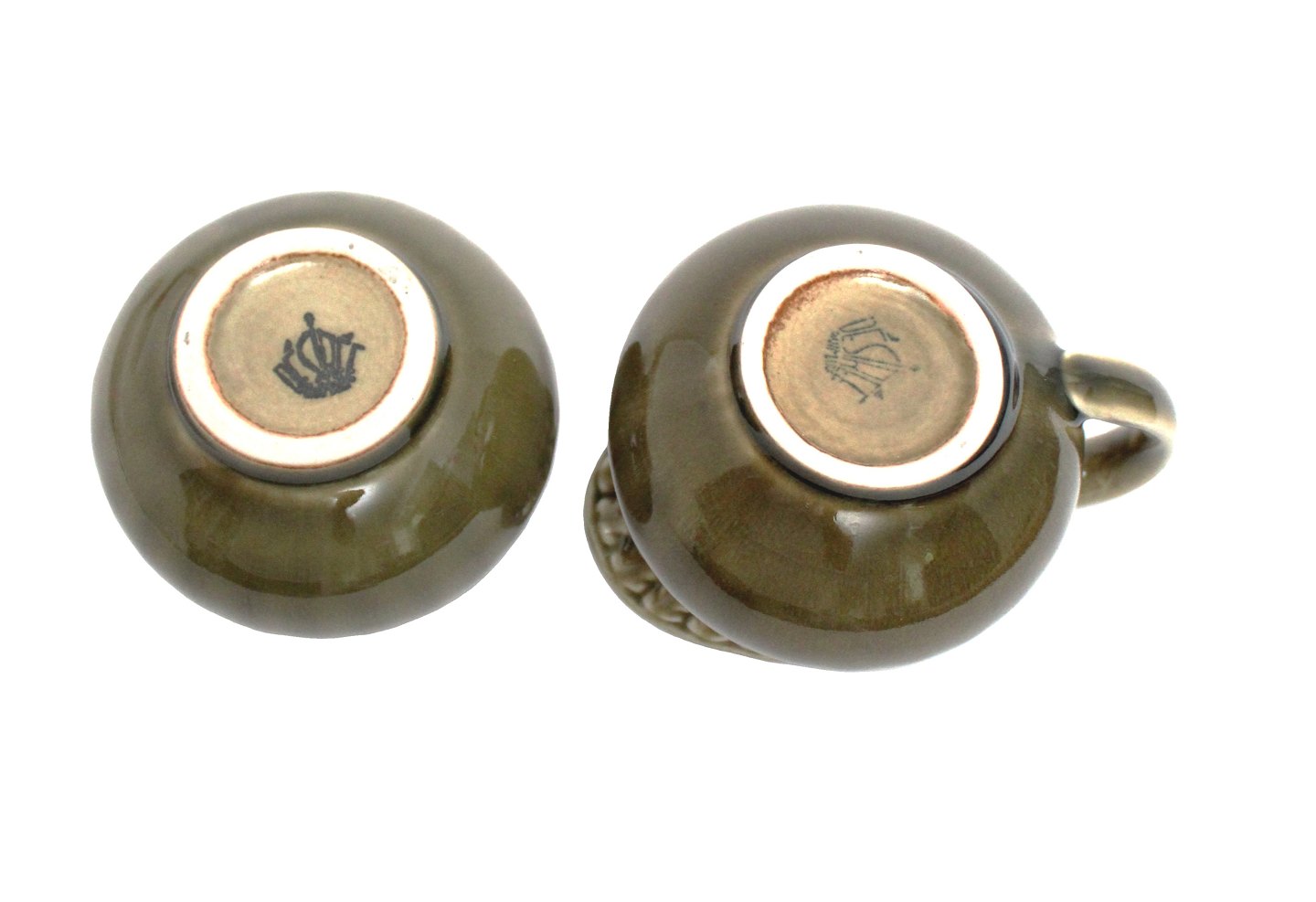 Desiree, Grøn glasseret Sukker og Fløde sæt, som vi desværre ikke kender navnet på, men som er yderst sjælden. Sukkerskål. Højde 6,5 cm. Største diameter 9,5 cm. Flødekande. Højde 7,5 cm. Længde 12,5 cm. Pris: 325 kr. for sæt. Lager: 1 sæt