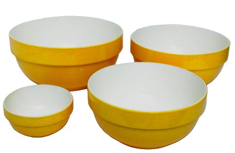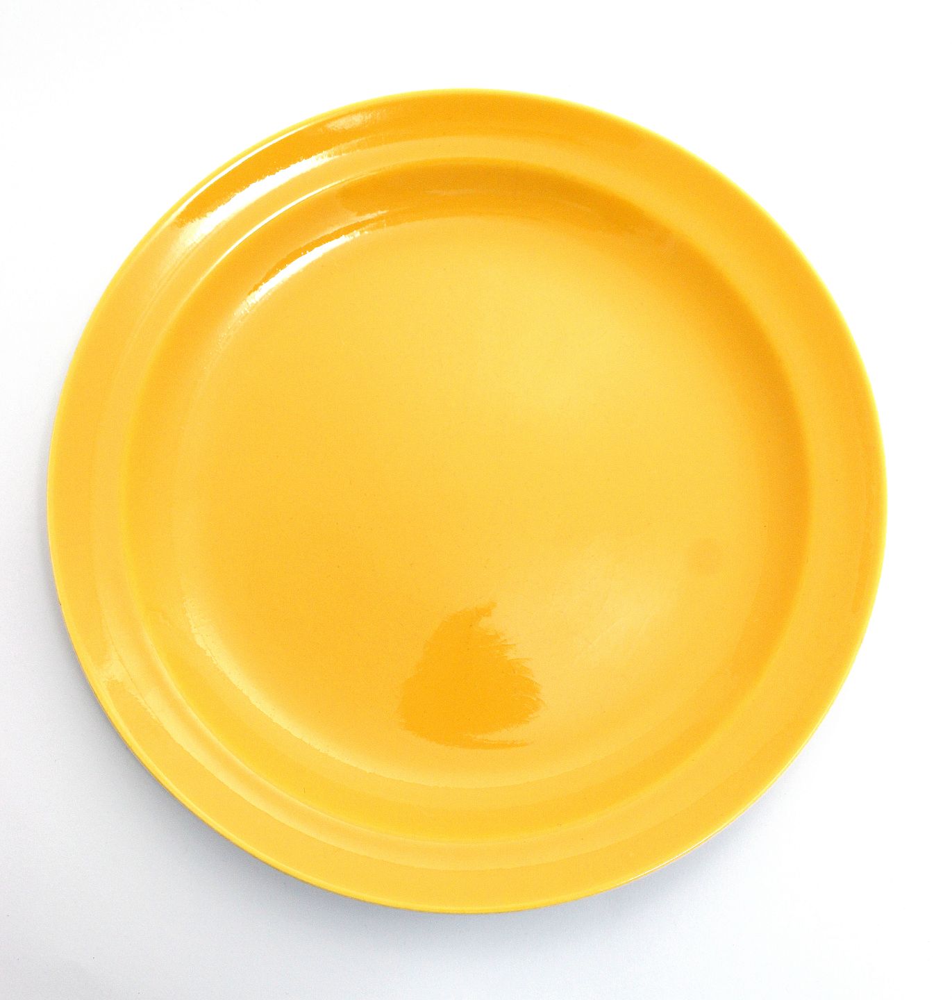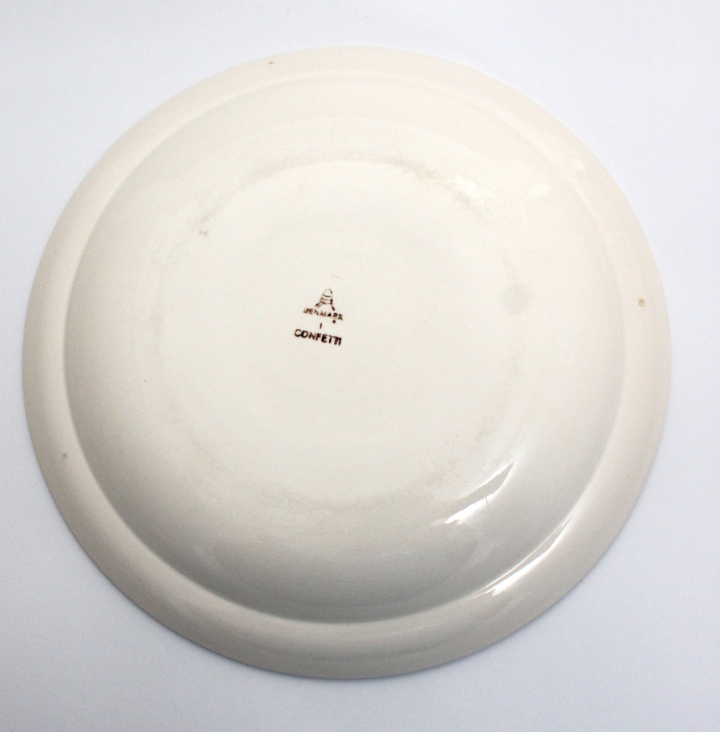 Aluminia, Susanne/Confetti rundt gult fad. Flot stand med lettere overfladekrakeleringer og mørke småridser i overfladen. Diameter 27 cm. Pris: 425 kr. stk. Lager: 1