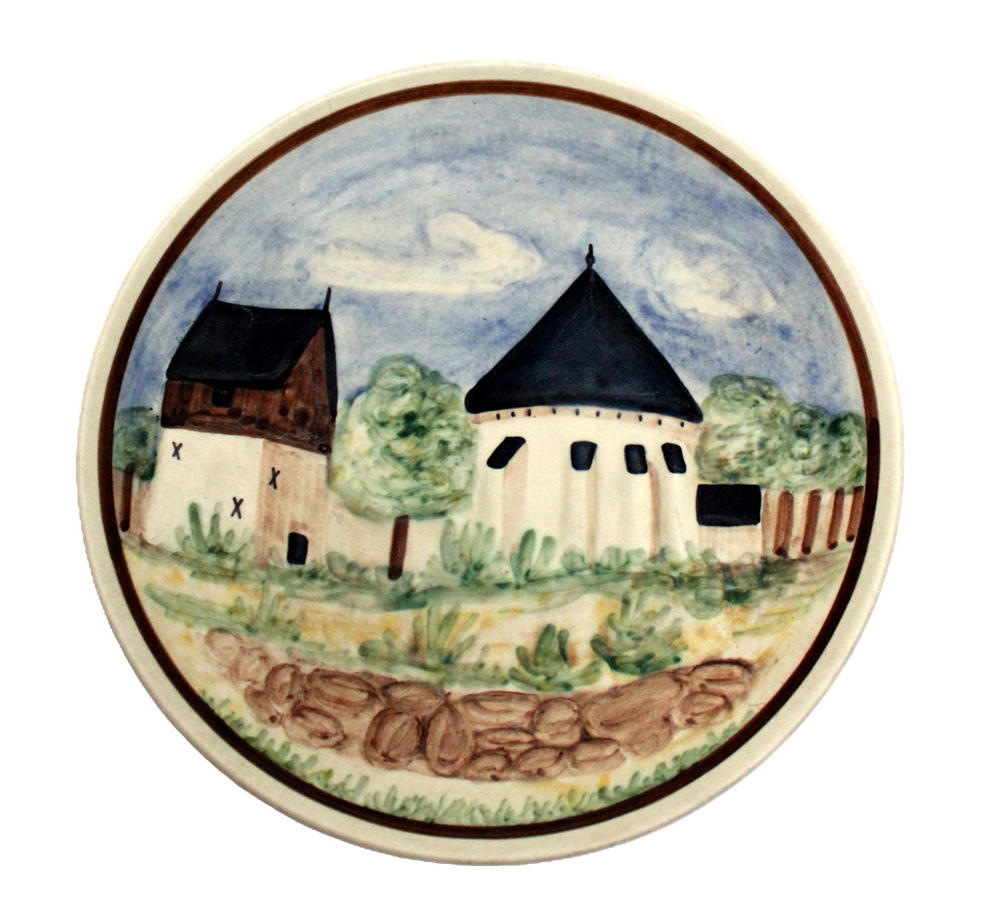 Søholm, Bornholm, Østerlars rundkirke. Ældre udgave detaljeret med skydeskår og støvet/duset farver. Nr. 456. Diameter 23 cm. God stand. Pris: 175 kr.