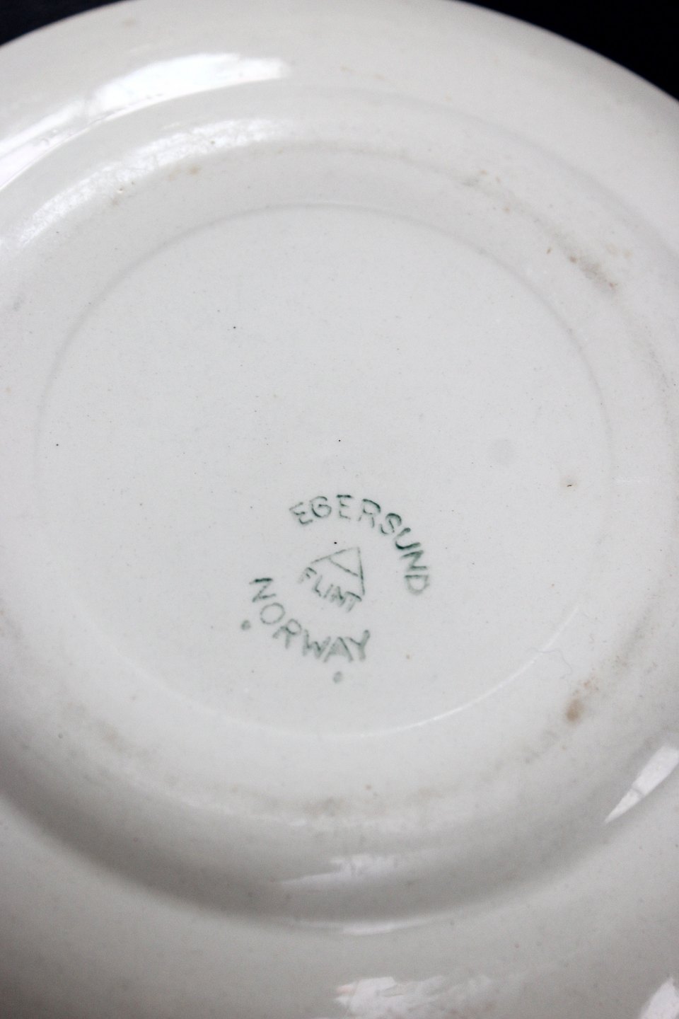 Egersund, Norway, Blå Fasan. Sidetallerken. Fajancestel med blomster og kun 1 fasan. Der er farveforskel og forskellige stempler alt efter, hvornår de er produceret. Diameter 17 cm. Almindeligt brugsslid, med få krakeleringer. Pris: SOLGT