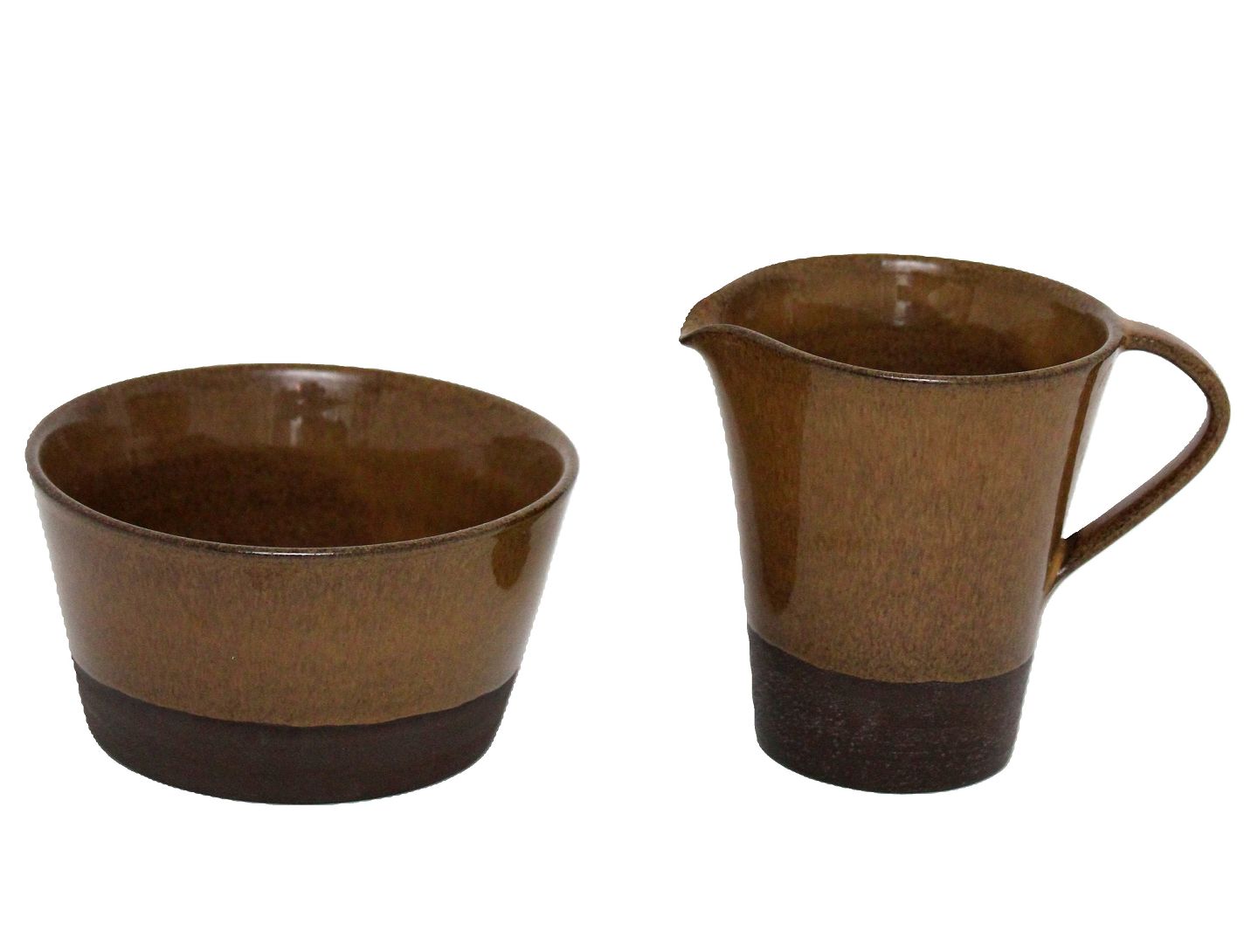 Kyhn, Sæt bestående af sukkerskål og flødekande i brun glasur med mat ru underdel. Fremstillet af pottemager Viggo Kyhn (1923-89) Viggo Kyhn var i lære hos Kähler og fik eget værksted i Skørping i 1960'erne.