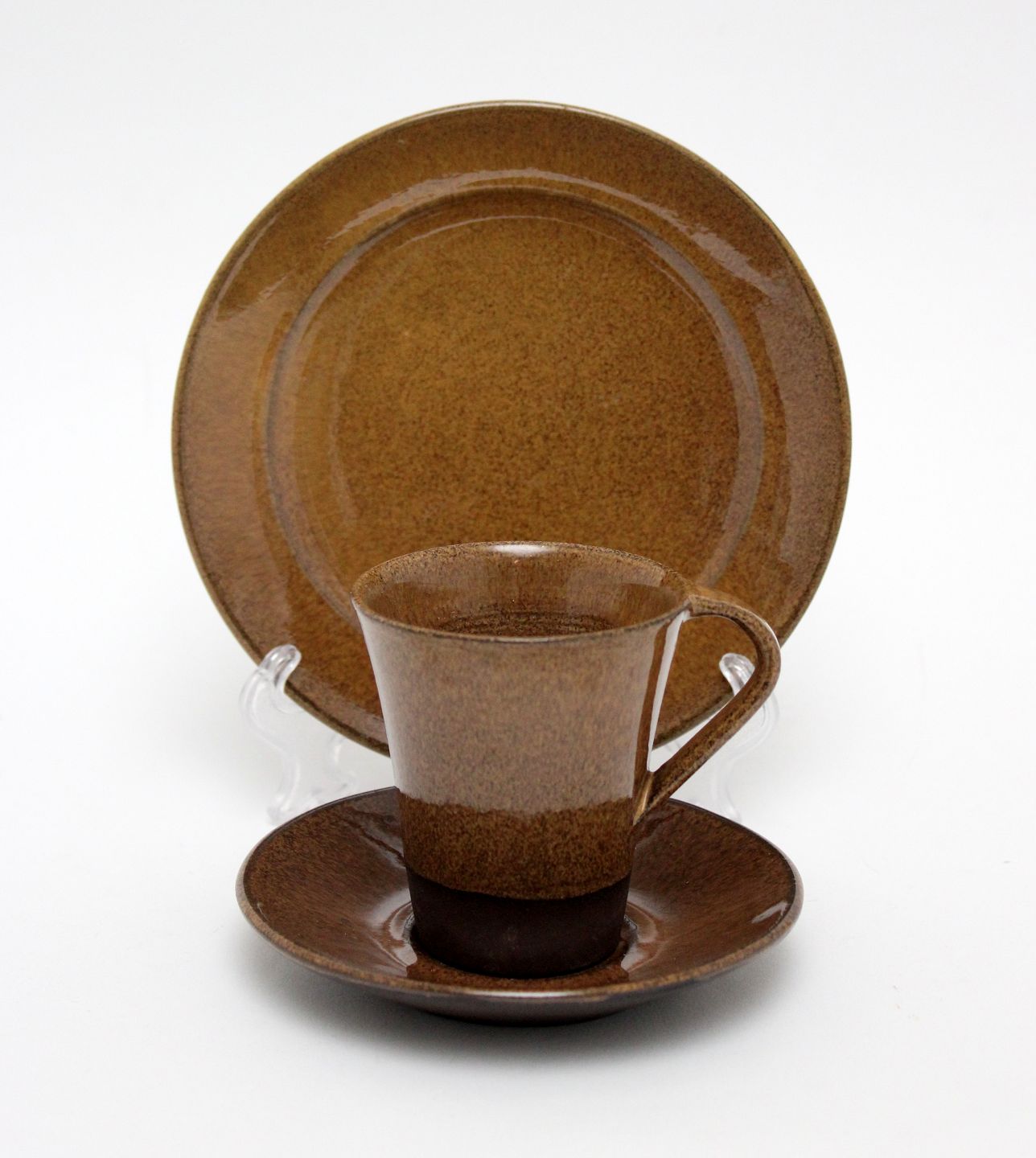 Kyhn, Sæt bestående af Espressokop, underkop og kagetallerken i brun glasur med mat ru underdel. Fremstillet af pottemager Viggo Kyhn (1923-89) Viggo Kyhn var i lære hos Kähler og fik eget værksted i Skørping i 1960'erne.