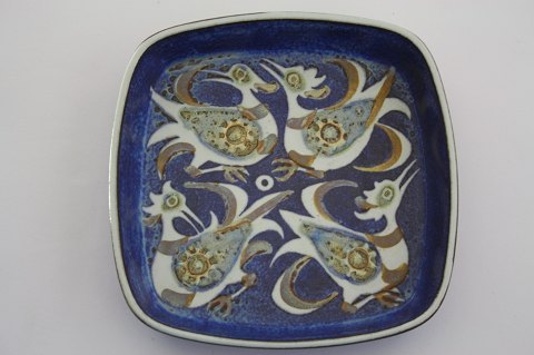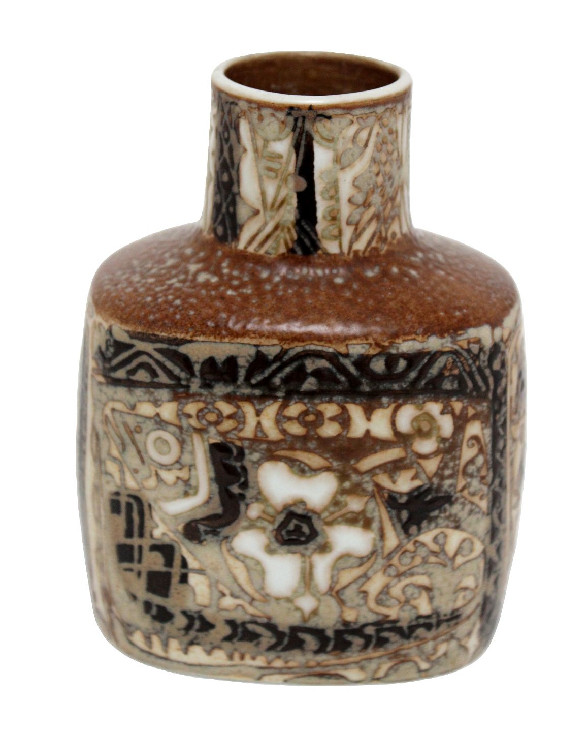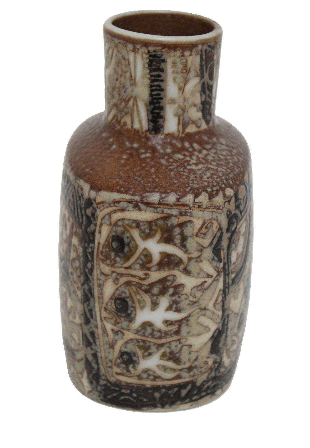Royal Copenhagen, Baca Kunstfajance firkantet lille vase i brun og gylden glasur med Fiskemotiver på alle 4 sider. Designet af Nils Thorson. Nr. 719/3207. Højde 13 cm. Længde 10 cm. Bredde 6,5 cm. Top diameter 4,5 cm. II. sortering. Pris: 300 kr.
