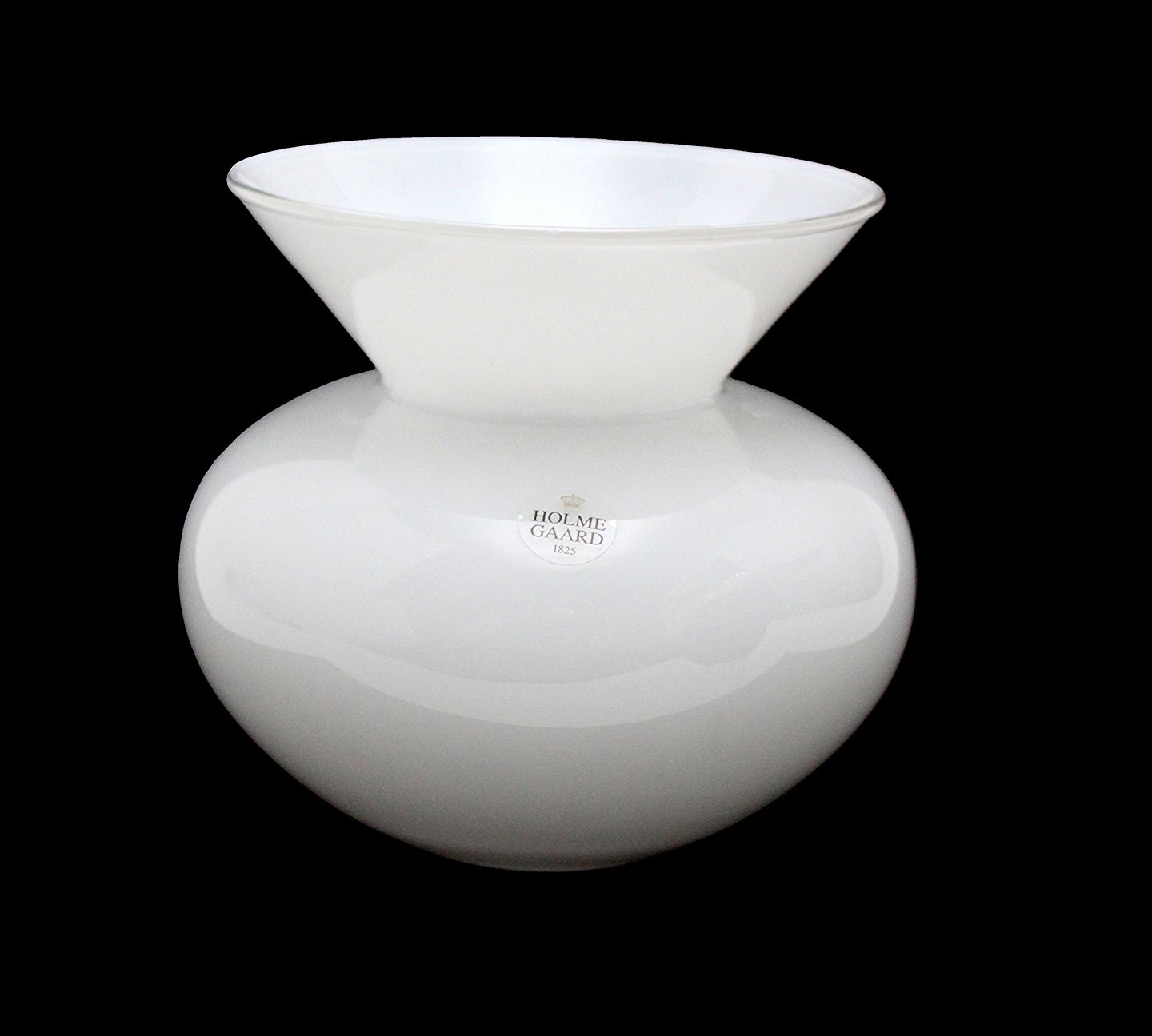 Holmegaard, Rokoko, Hvid opaline vase lav model, kugleformet korpus og tragtformet hals. Designet af Torben Jørgensen i 2006. Højde 13,5 cm. Diameter 14 cm. Øverste diameter 13 cm. Holmegaard label, ingen signatur. Pris: 375 kr. stk. Lager: 1