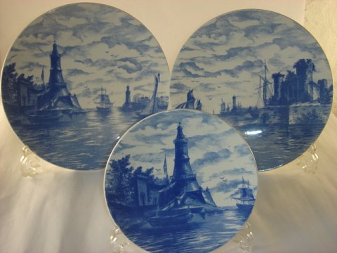 2597 V. Blåmalet platte. Motiv sejlbåd og mølle. Fin stand. Diameter: 18,5 cm. 50 kr. stk.