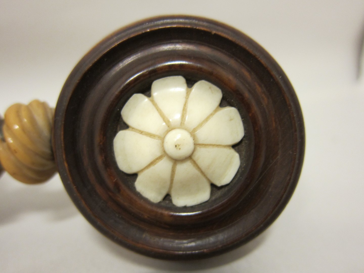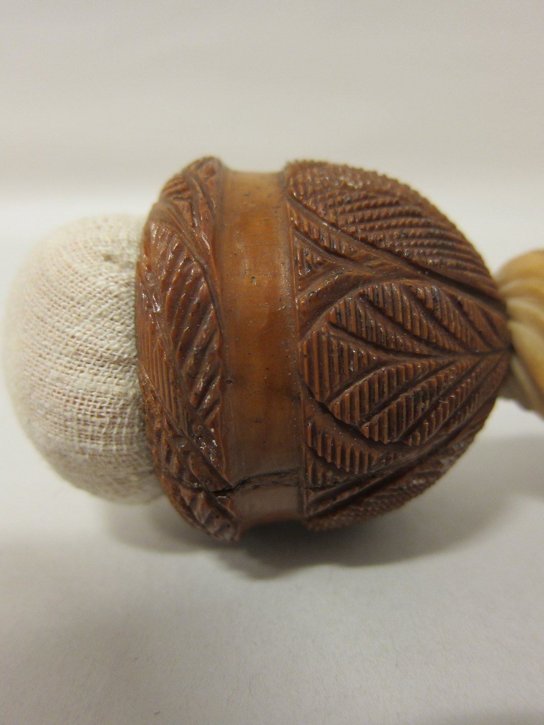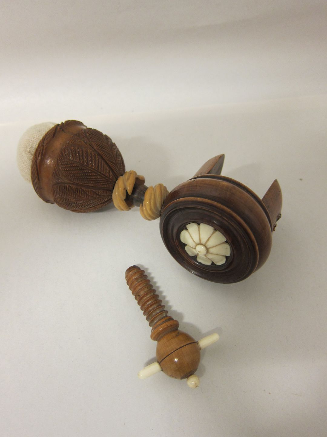 Syskrue, antik, med nålepude Rigt udskåret og dekoreret med nålepude og skrue til fastspænding på bord L: 20cm Varenr. 41012 Klik for mere information