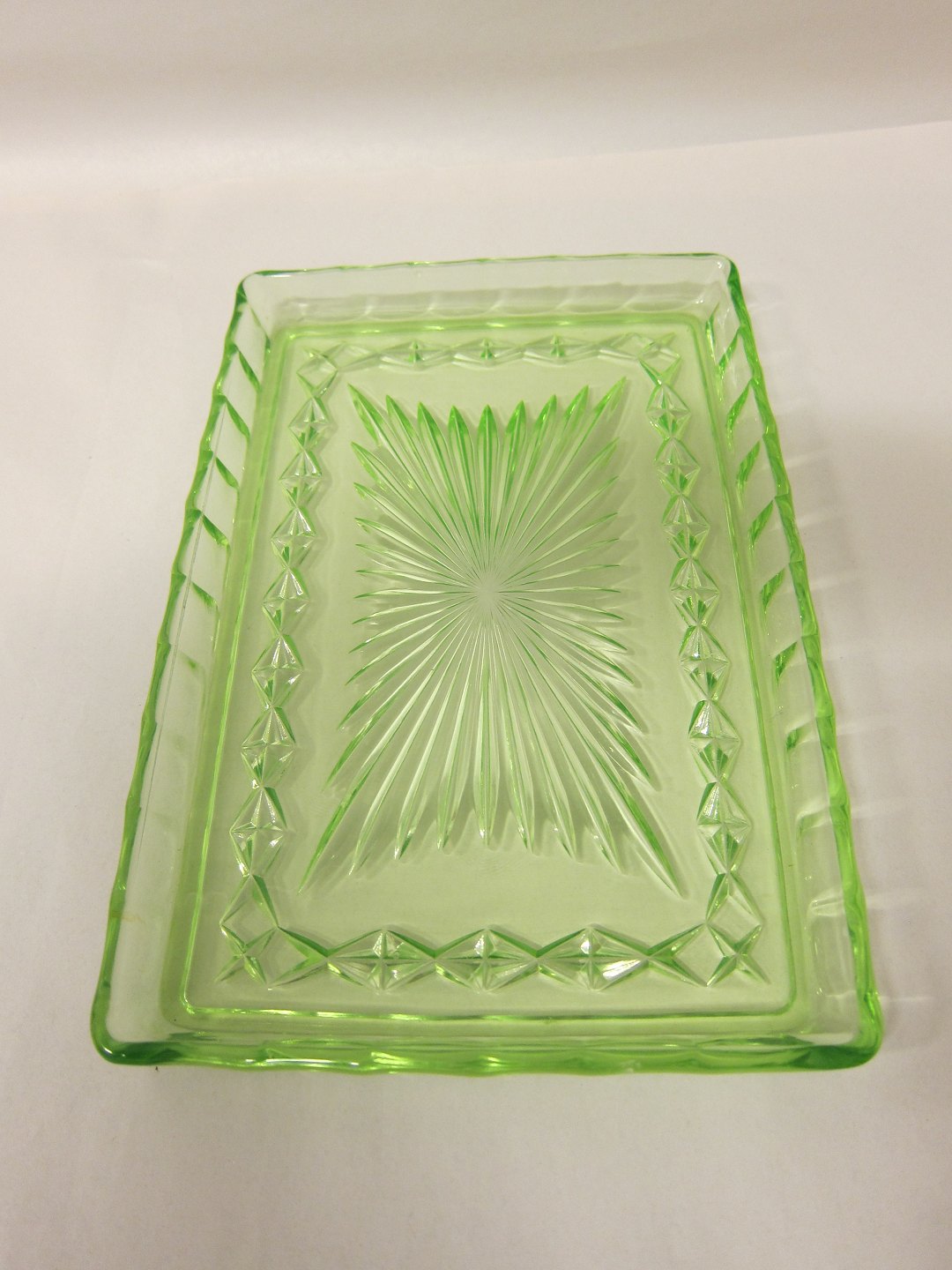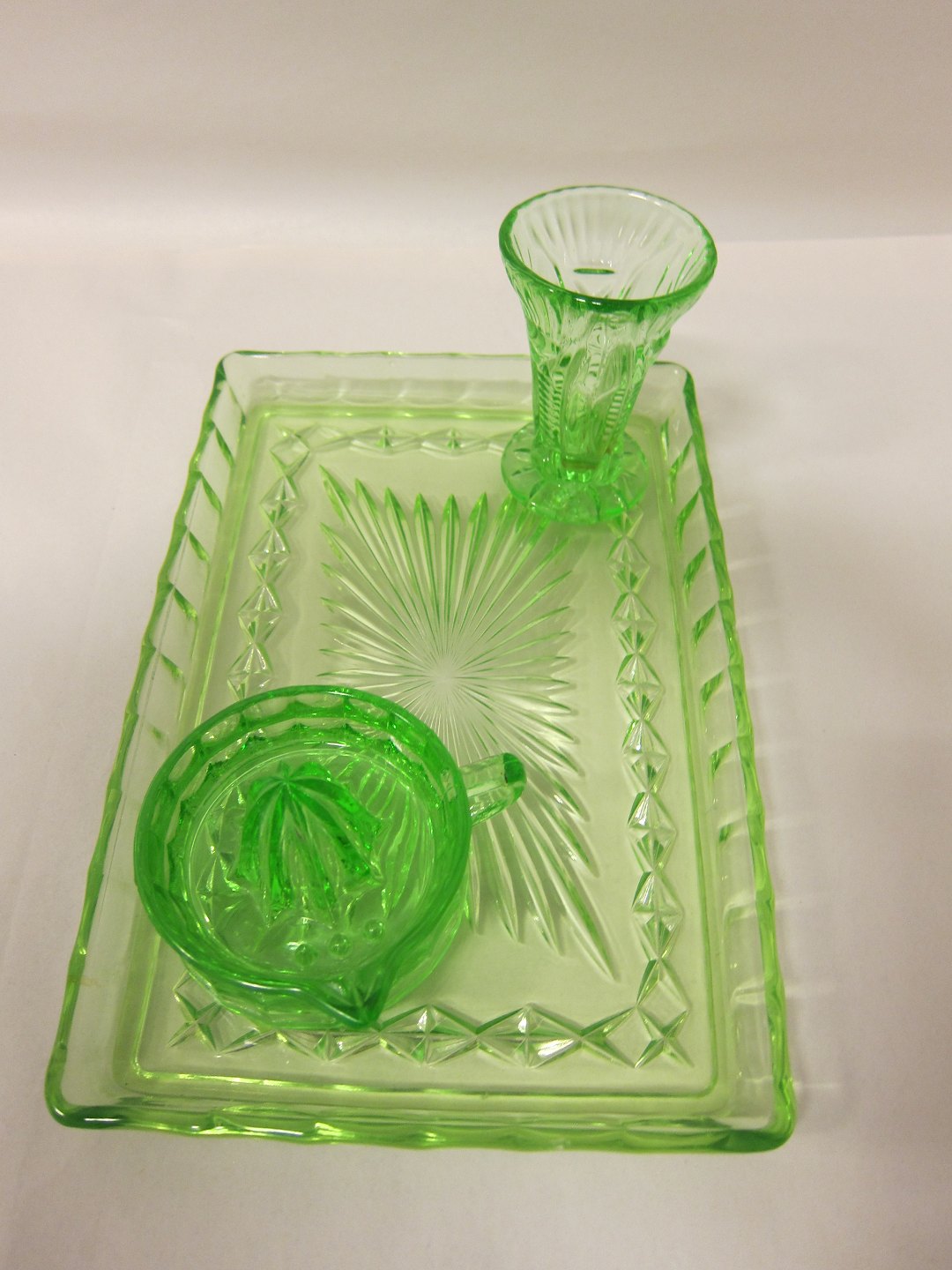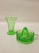 Presset grønt glas, bestående af glasbakke, glasvase og citronpresser. Bakke: 29,5 x 19,5cm - Vase H: 10,5cm - Citronpresser: diam 9,5cm Varenr. 51011