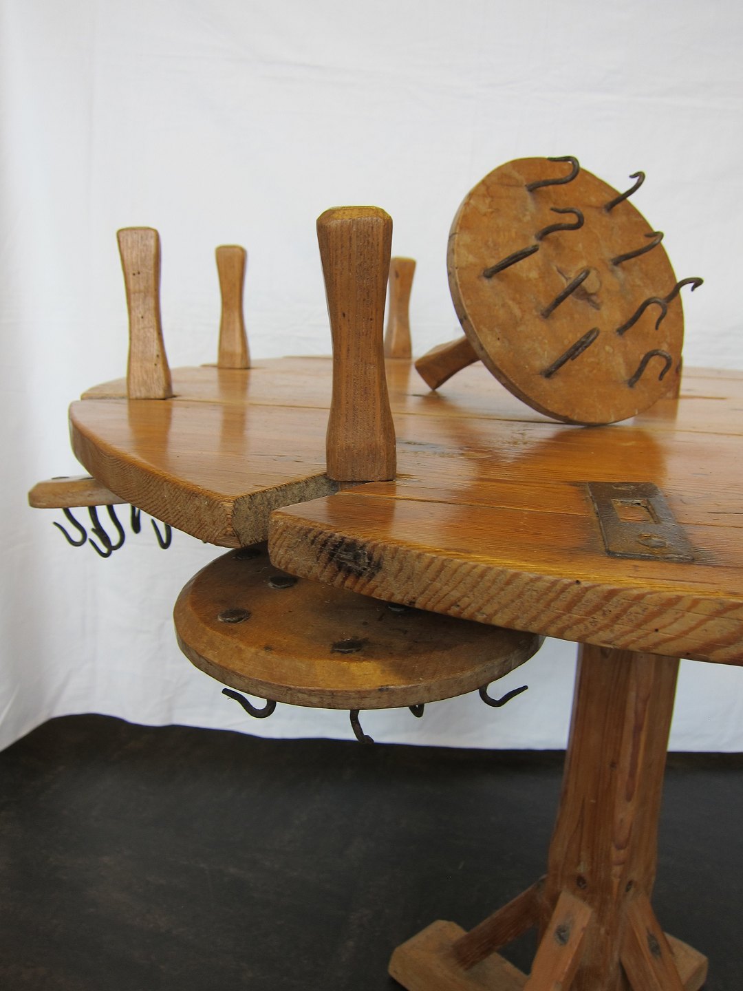 The candles were placed on the hooks, hanging from the round holder. It is possible to place about 100 candles in all "under the table", and each of the round holders can be taken off the table (please look at the photos).