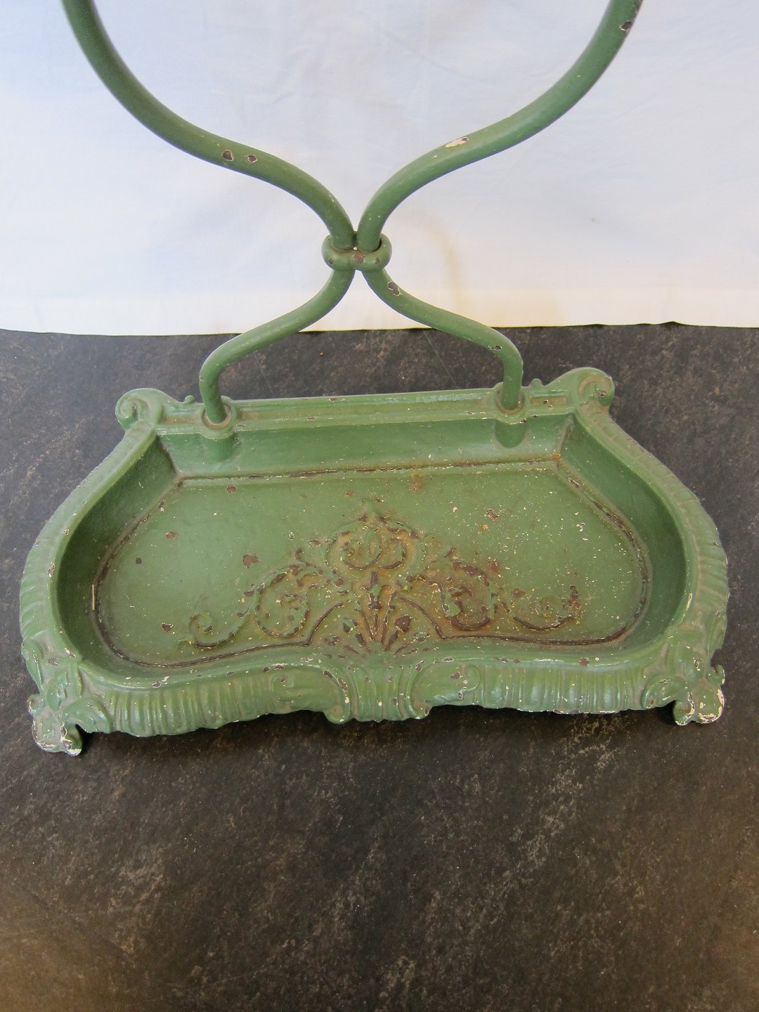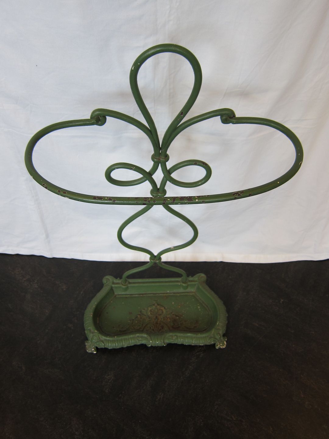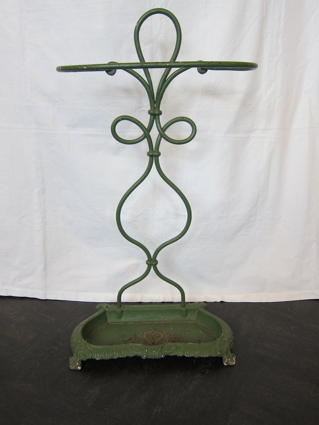 Flot gammelt paraplystativ i grønmalet jern med smukke former og dekorationer