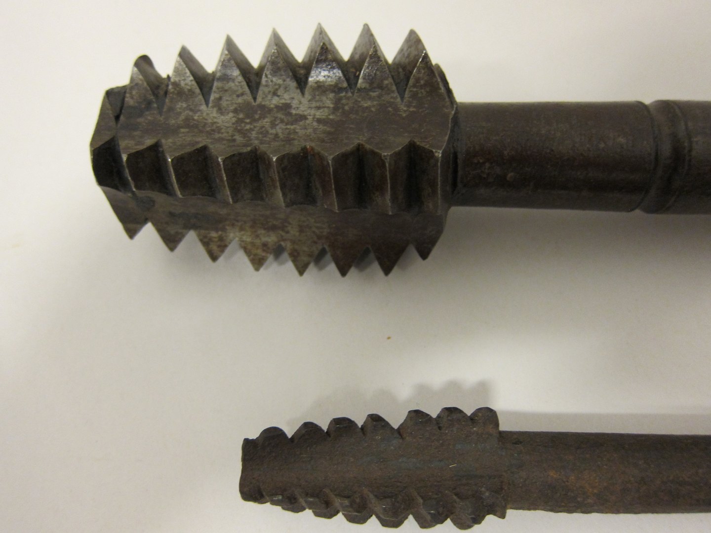 Gevindskærere Gamle gevindskærere til at skære gevind i træ L: stor 25cm (stor=solgt), lille: 19cm Varenr.:41962