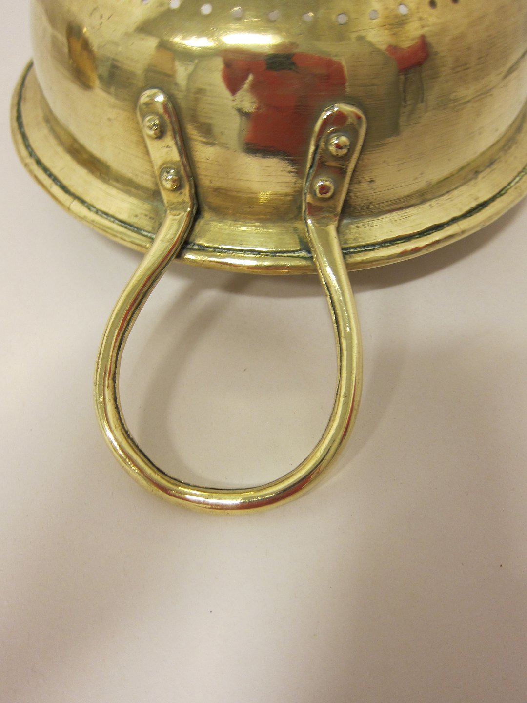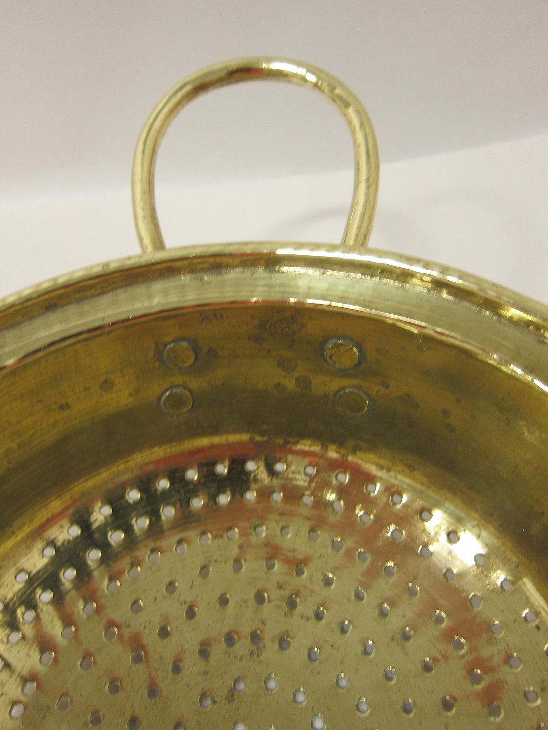 Dørslag af messing Antikt dørslag med 2 smukke ører Ca. 1840 Diam. m/ører: 36cm, u/ører 23cm H: m/ører: 11,5cm, u/ører 8,5cm Ikke stemplet Varenr.: 41313