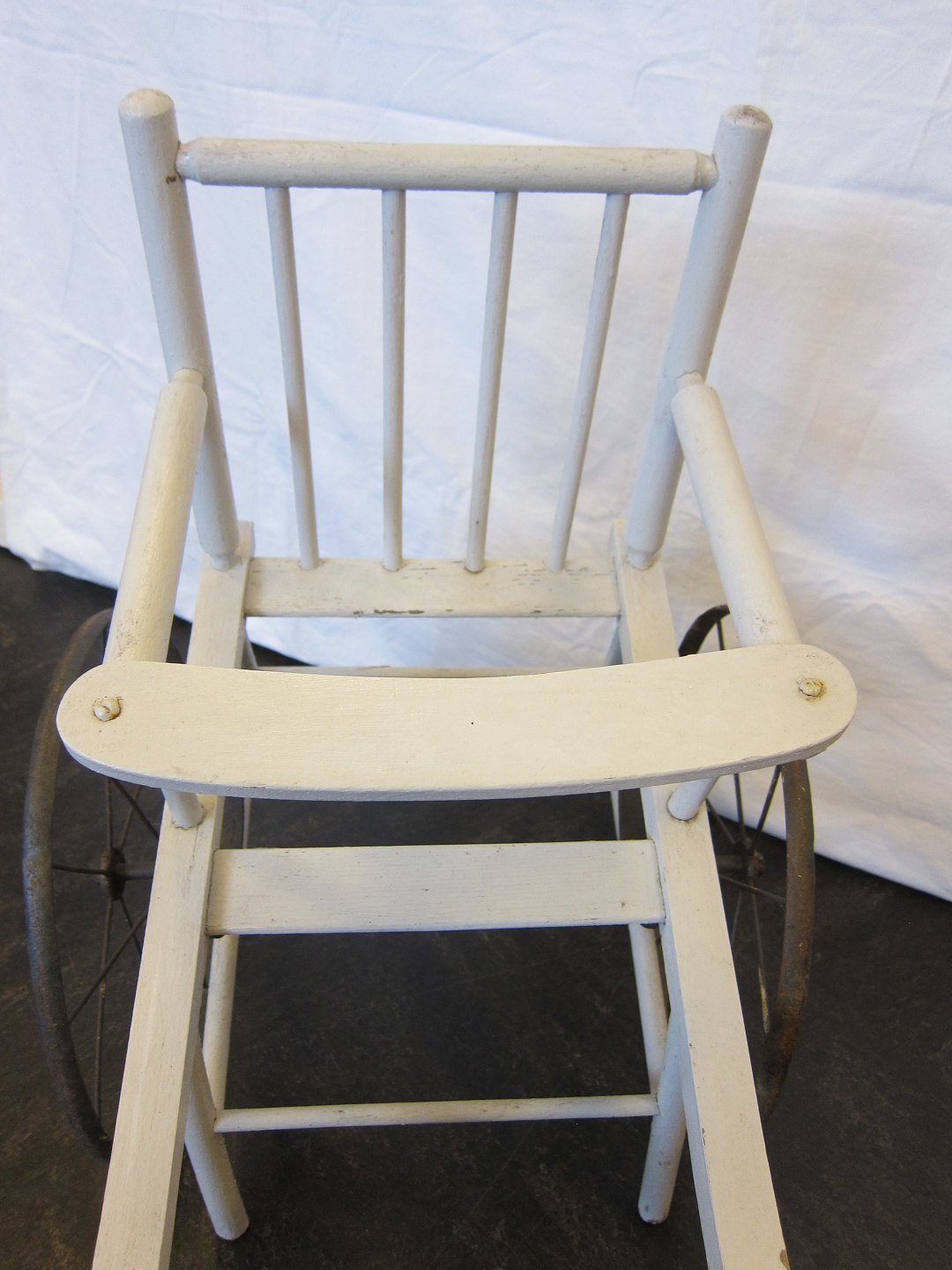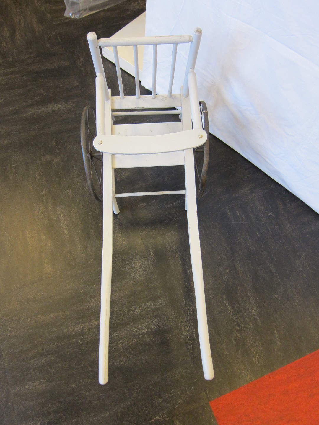 Dukke-klapvogn Gammel dukkeklapvogn i træ med jernhjul H: 52cm, L: 78cm Varenr.: 411102