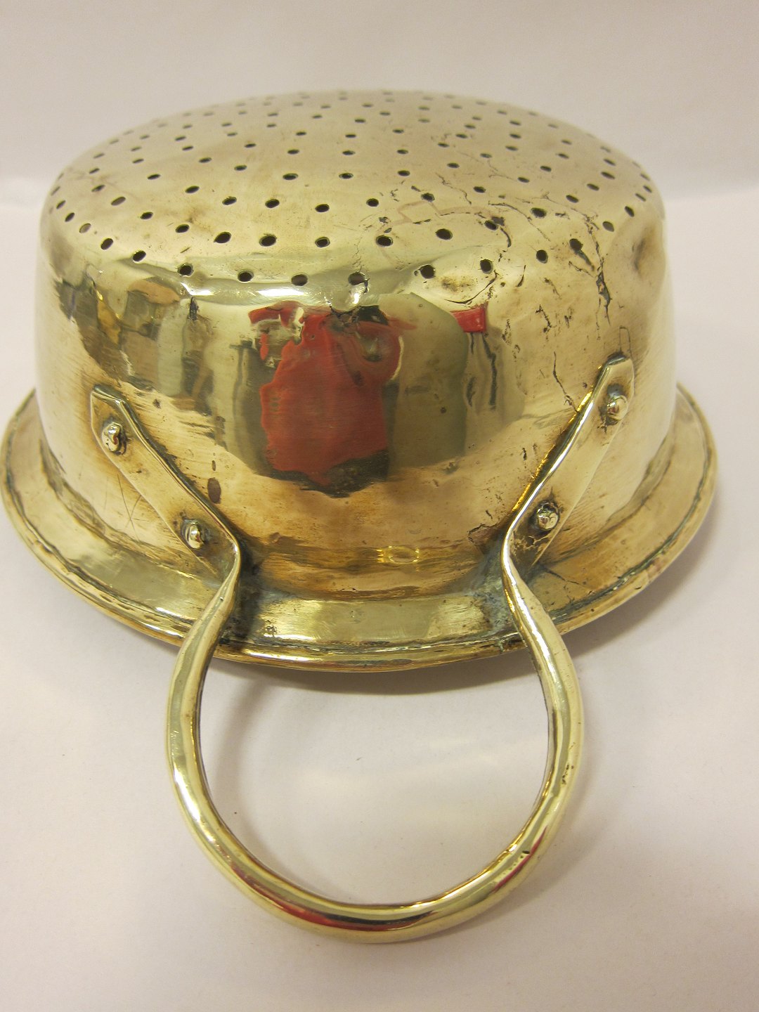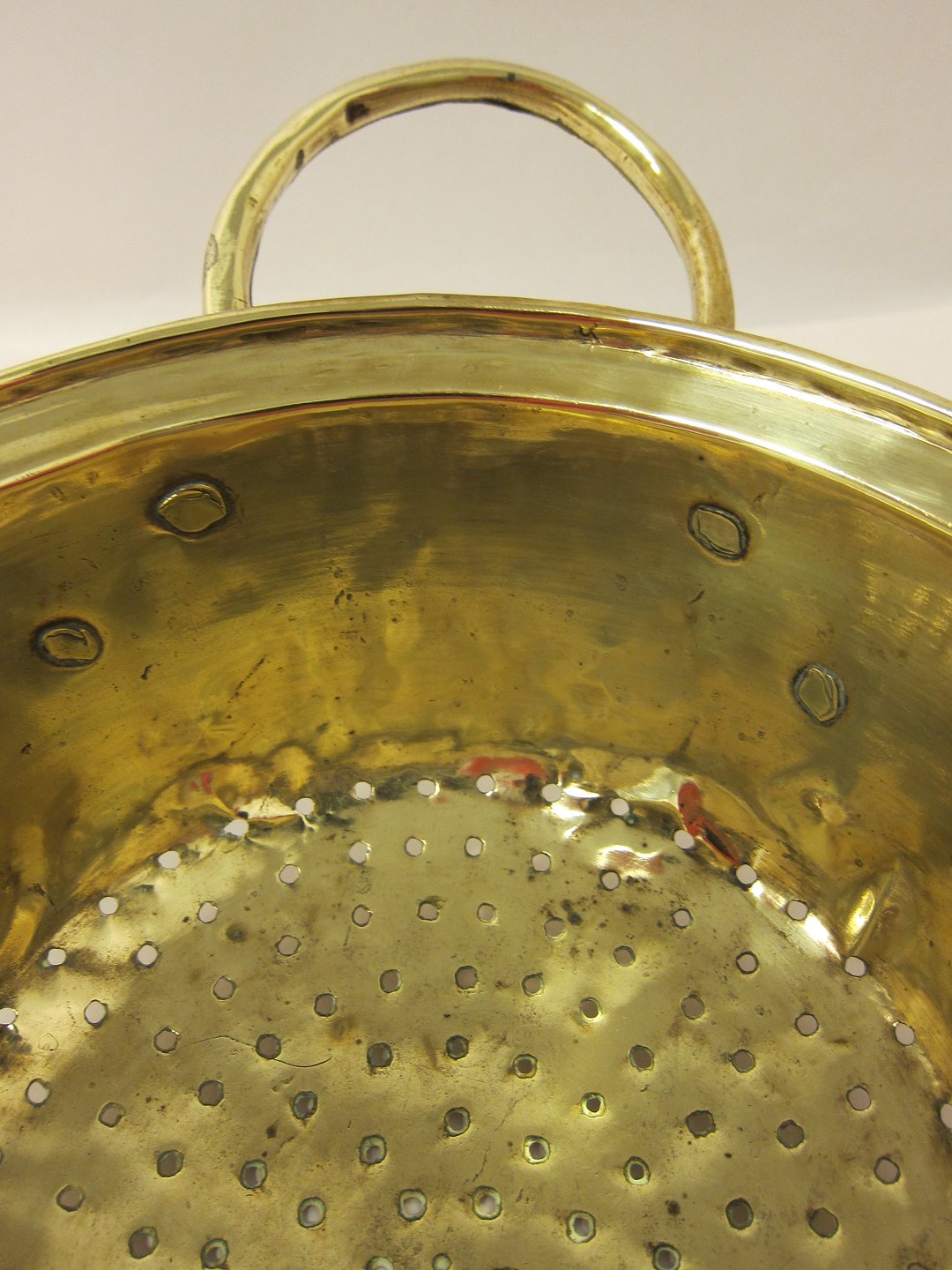 Dørslag af messing Antikt dørslag med 2 smukke ører Ca. 1840 Diam. m/ører: 35cm, u/ører 23,5cm H: m/ører: 13cm, u/ører 10cm Ikke stemplet Bemærk: Små buler på kant Varenr.: 31641