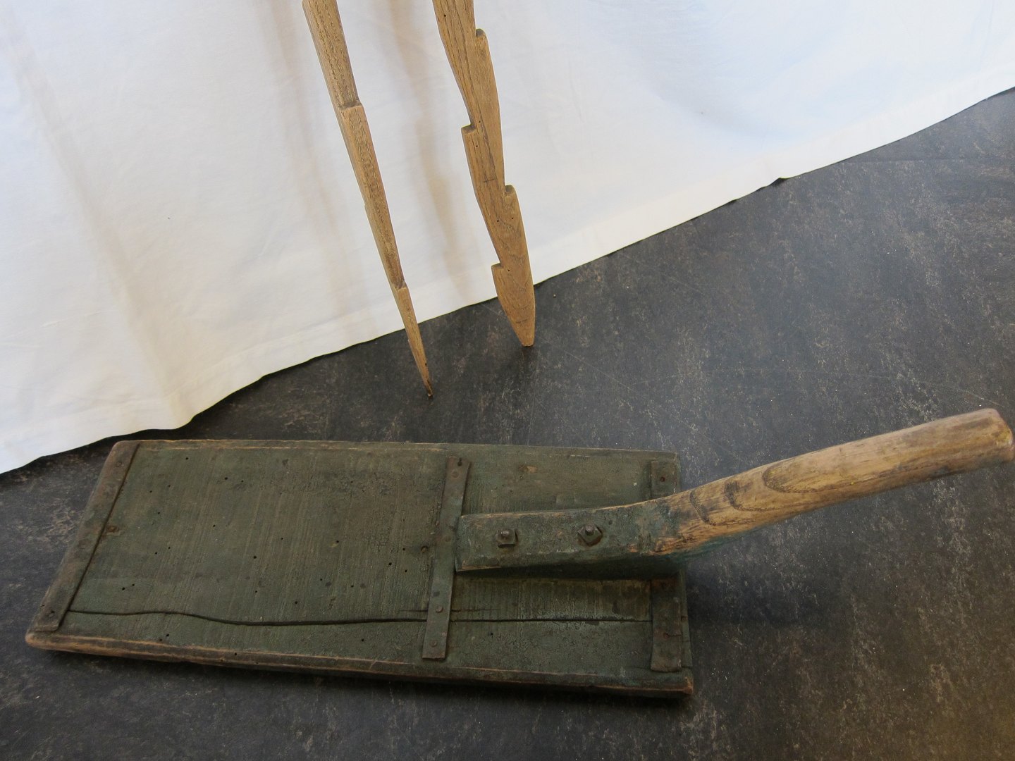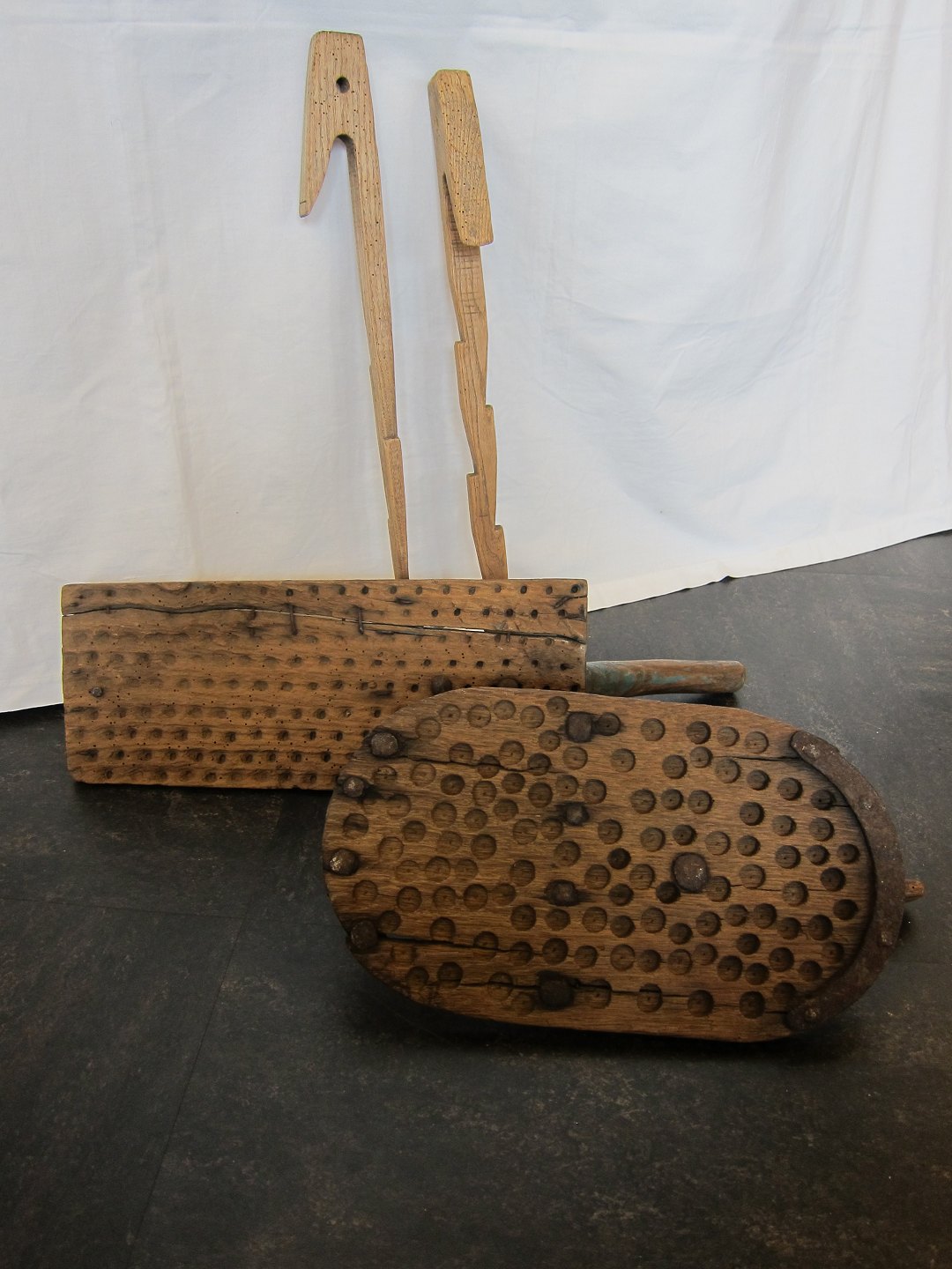 Disse redskaber er gammeldaws udgaver af bl.a. tækkeskovle/-klappere, som tækkemanden brugte til at banke stråene på plads, når taget skulle tækkes