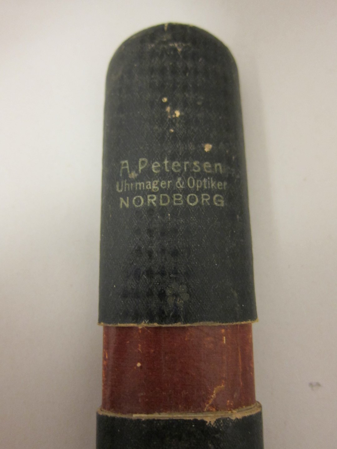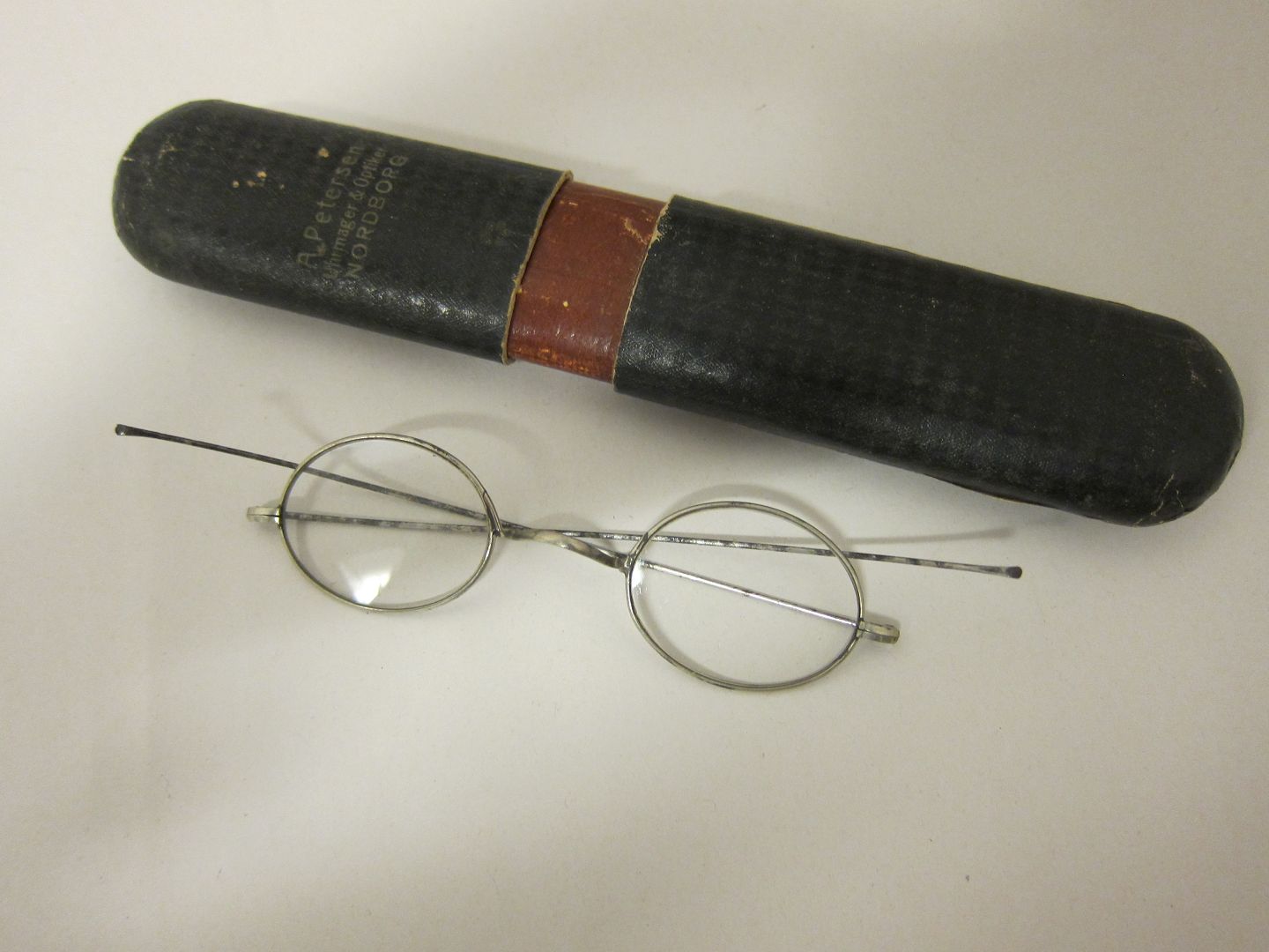 An old pair of glasses with case with inscription: "A. Petersen, Uhrmager & Optiker, Nordborg" (from Als in South Jylland, Denmark)