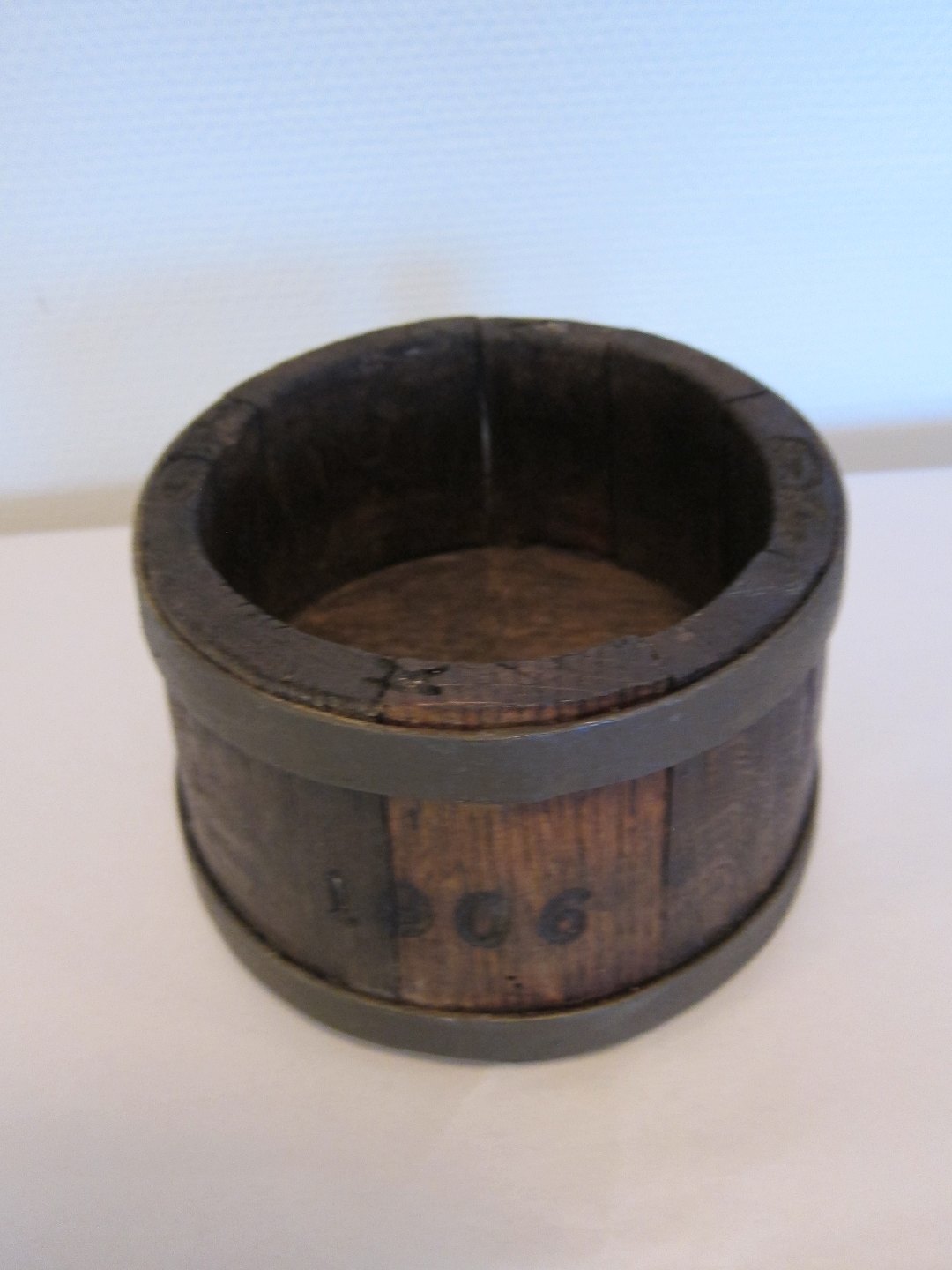 Bushel (1/16) measurement made of wood, from 1906 With bands made of iron, With stamp D top: 15,5cm, D bottom: 17,5cm Articleno.: 411171