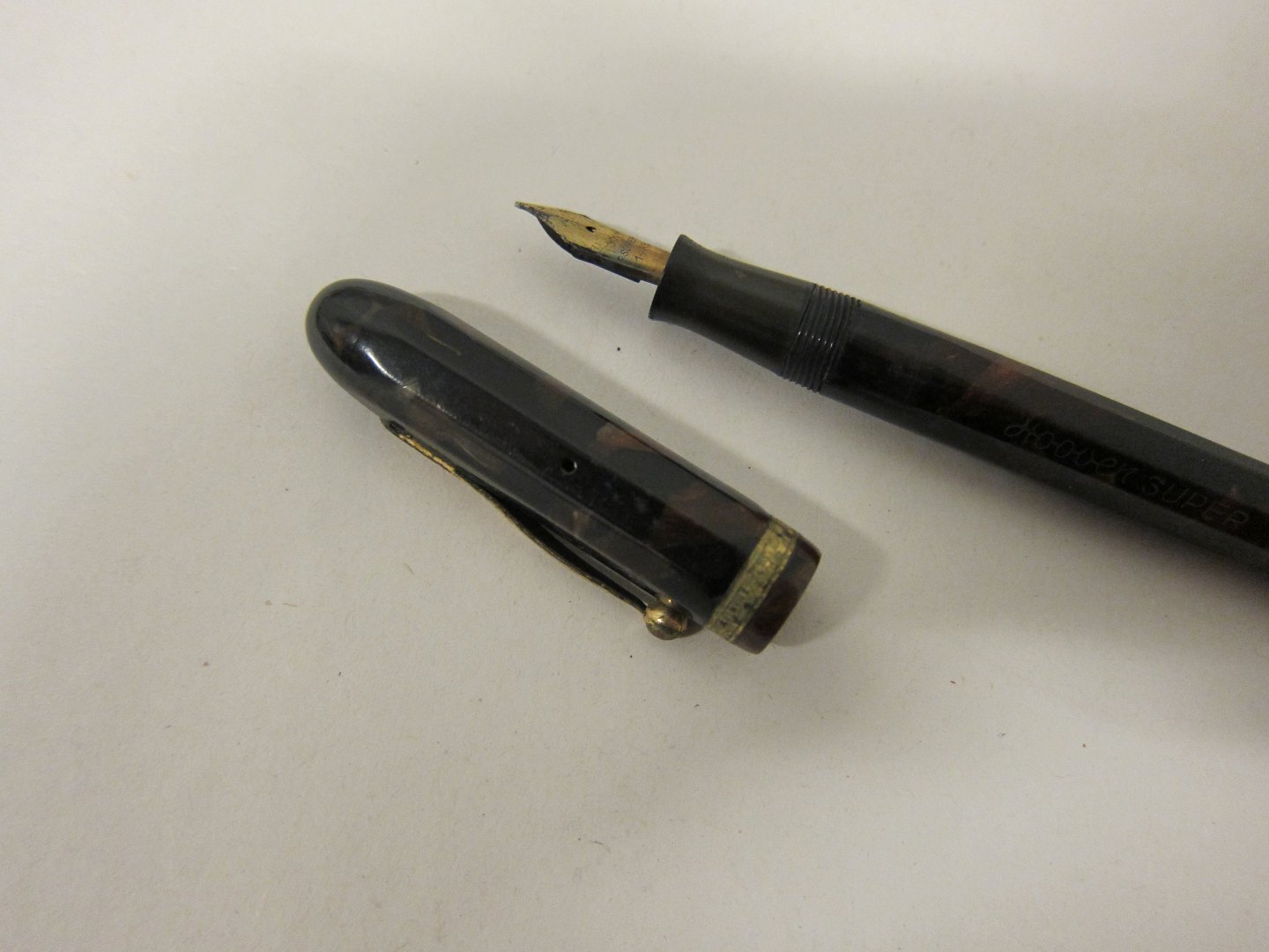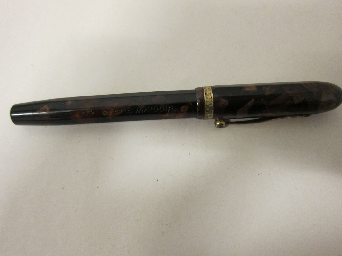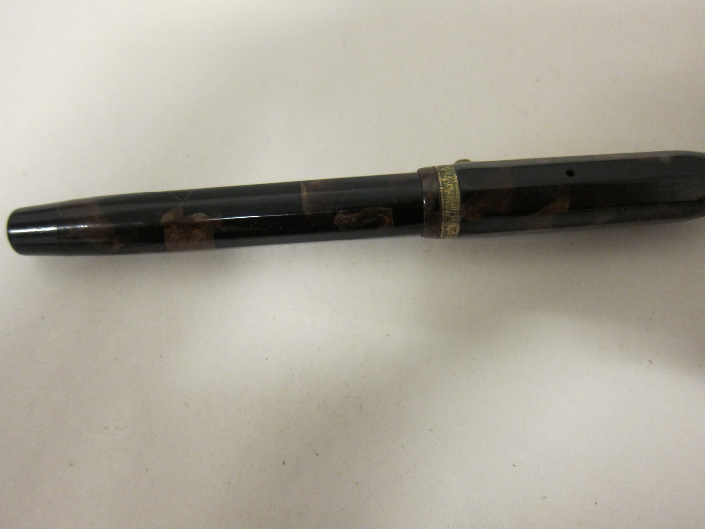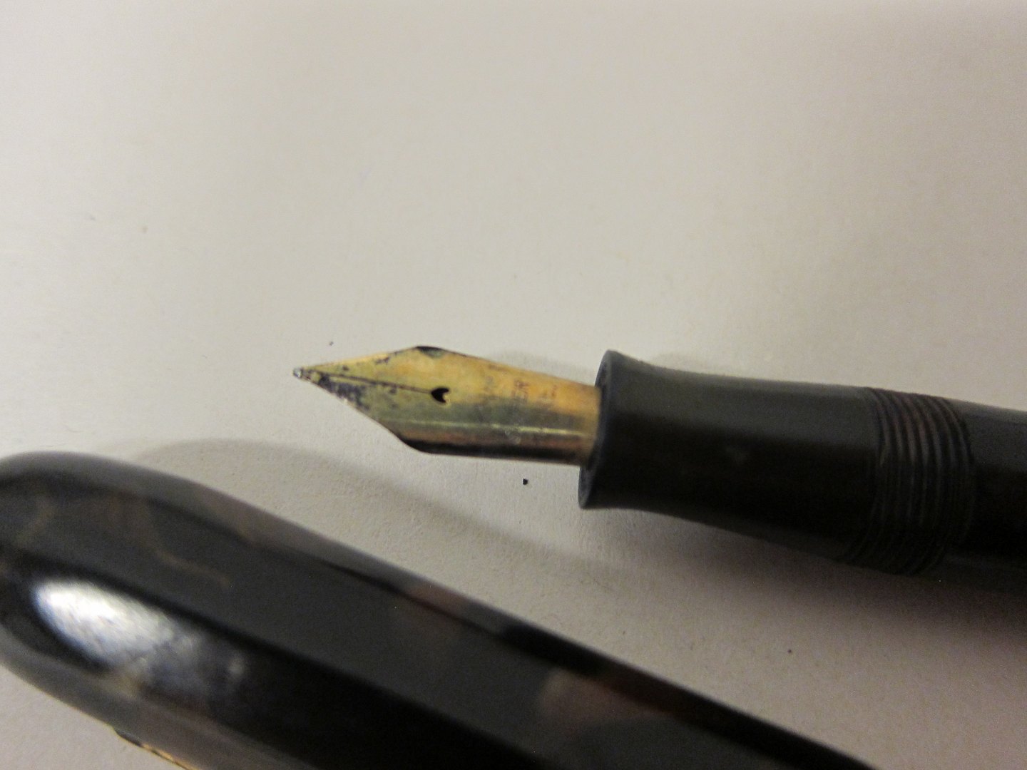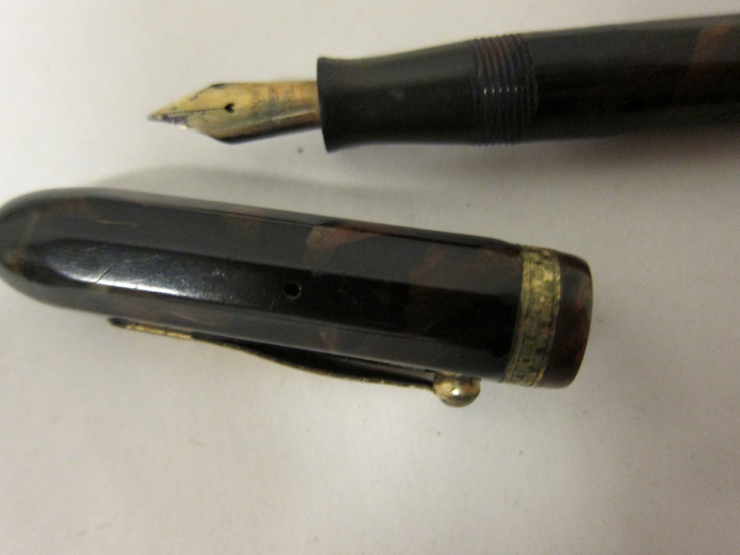 Fyldepen Hoover Super 343 Brun marmoreret 12-kantet skaft Penhoved 14 karat guld Stemplet: Hoover super 14 kt Vi har flere andre fyldepenne Kontakt os for yderligere information Varenr.: 1006