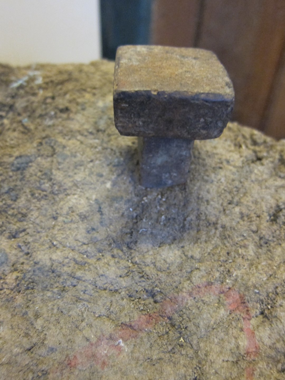 Gammel huggeblok med harre-jern (jern-stykke til at hamre le'en skarp, da man ikke alle steder kunne slibe le'en)