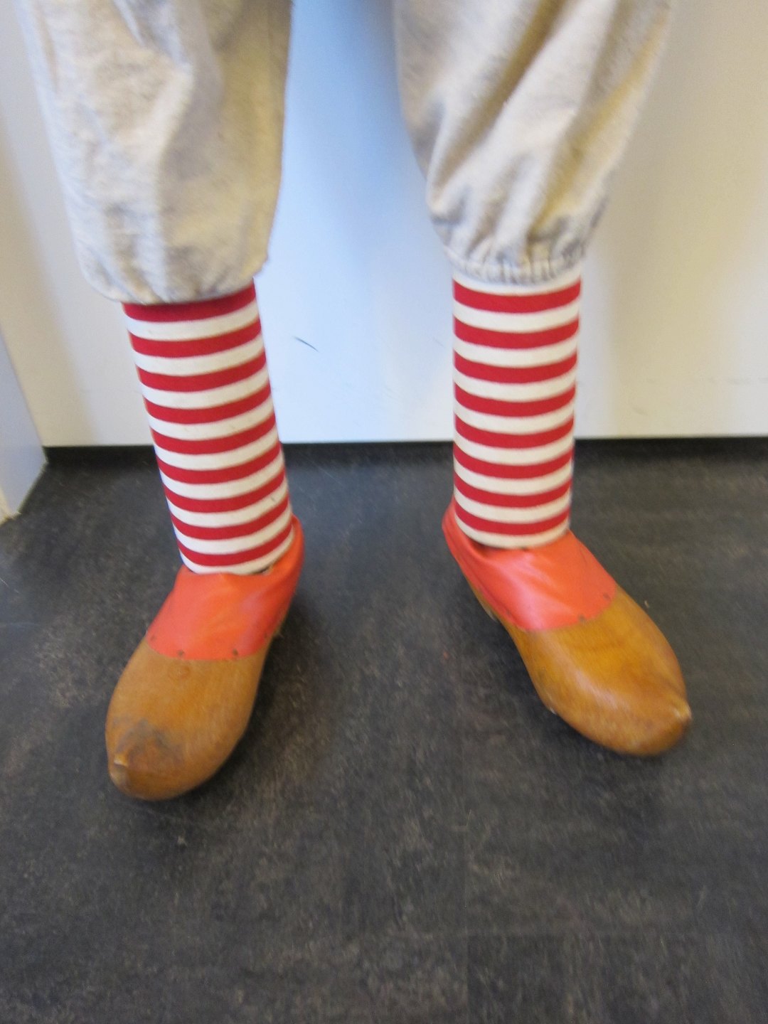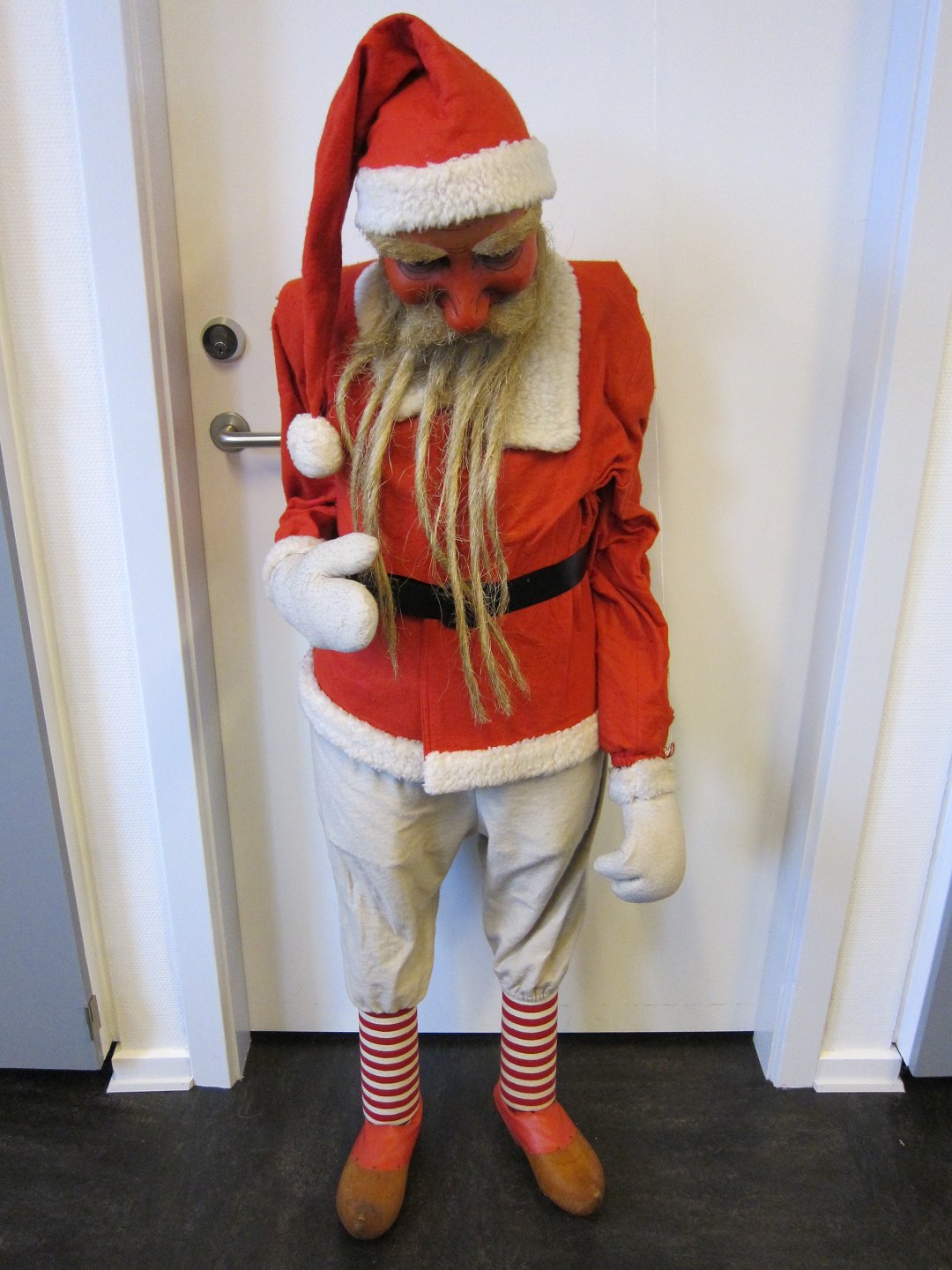Julemanden er fremstillet i bemalet papmache og ståltrådsbeklædt træ med nissetøj og træsko