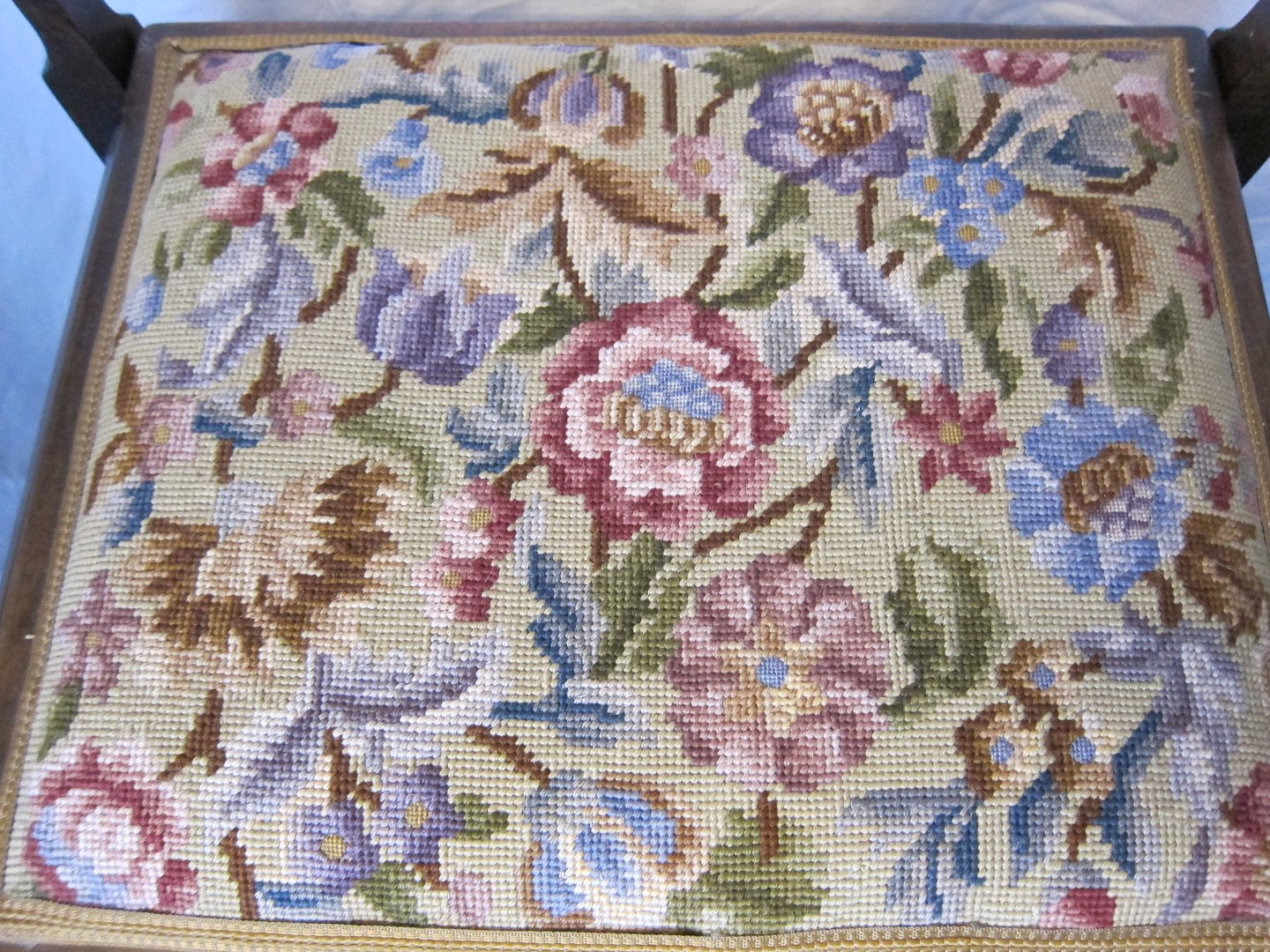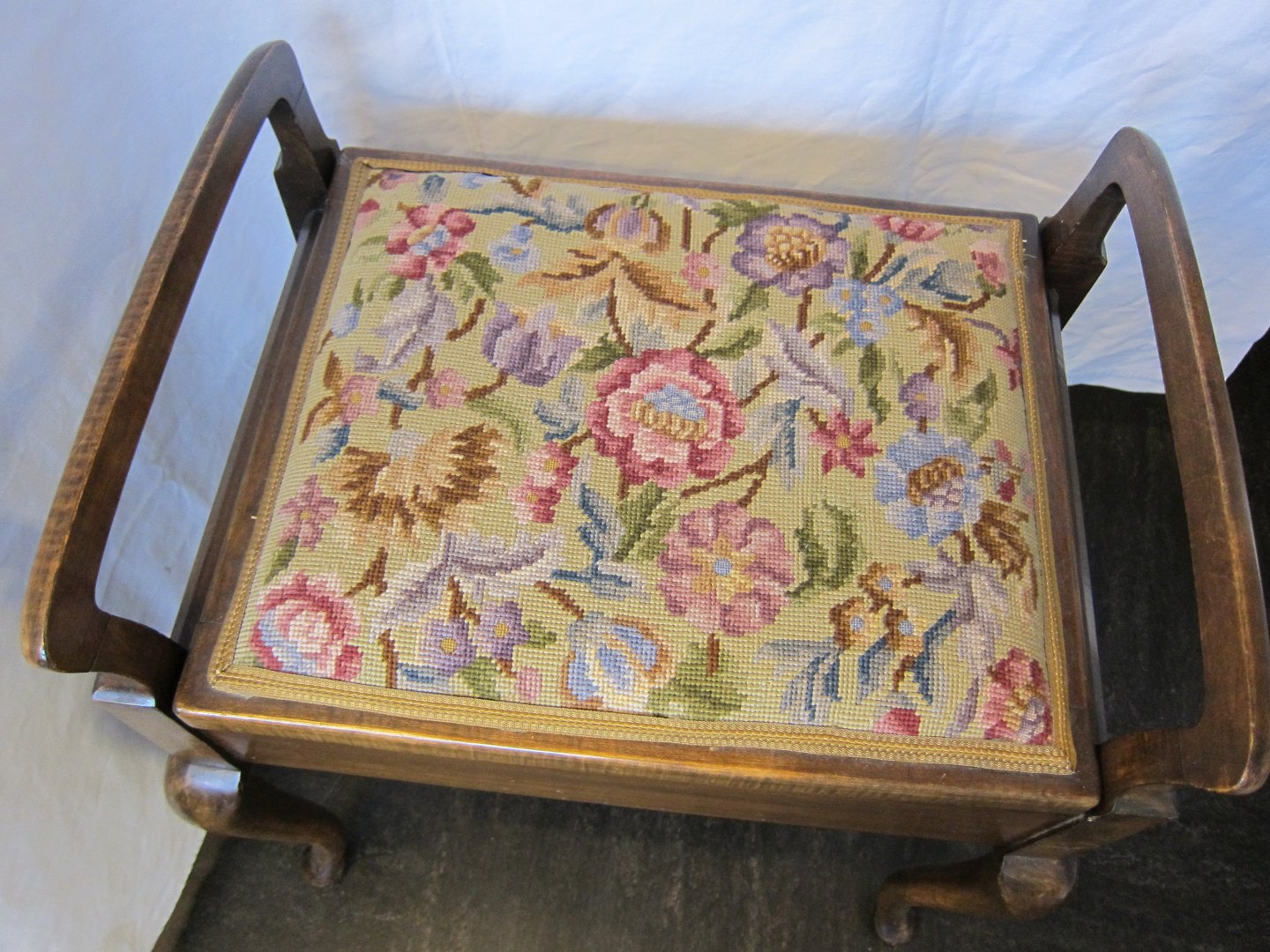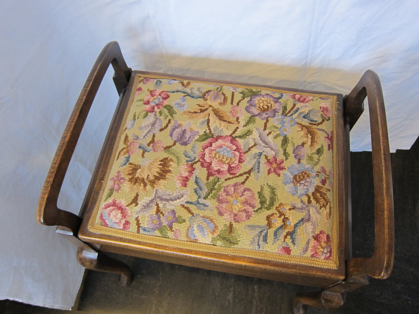 Taburet/klaverbænk med 2 "håndtag" og et meget smukt korsstingbroderi (intakt) på sædet