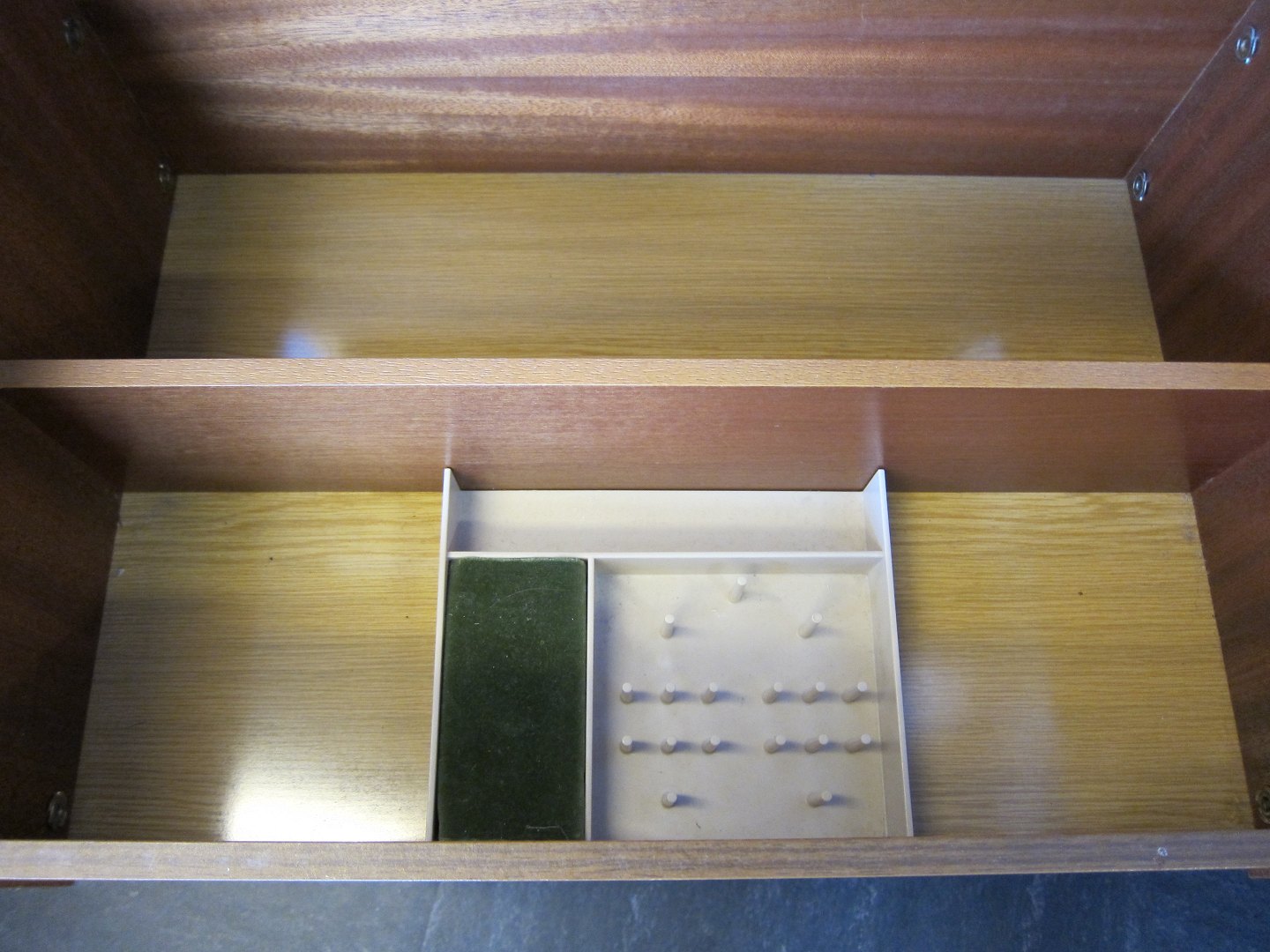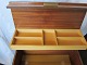 Kan åbnes, hvilket giver et rum med ruminddeling, trådholdere og nålepude