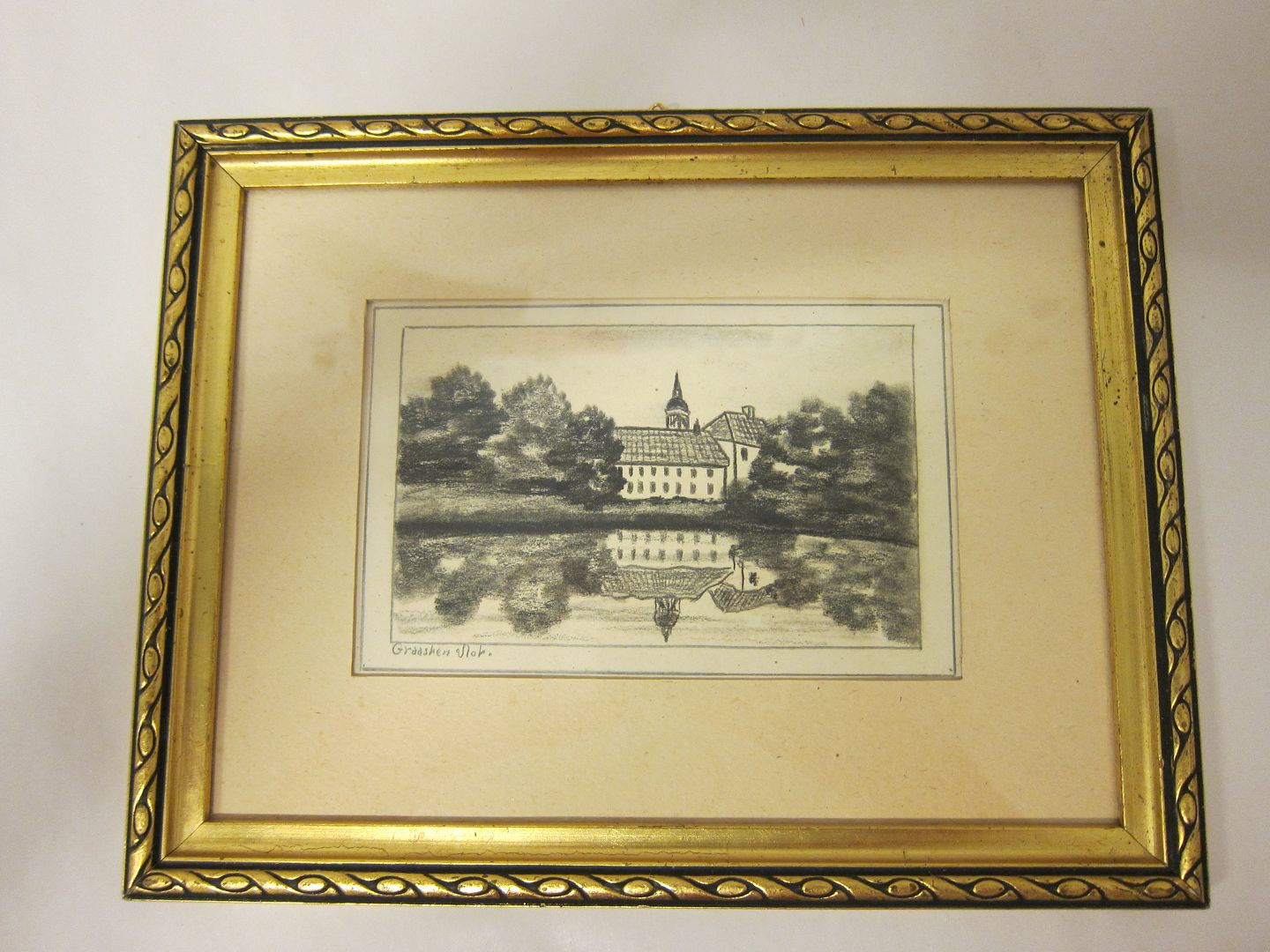 Kultegning af Gråsten Slot Kultegningen af Gråsten Slot er indrammet i gammel ramme Varenr.: 312161