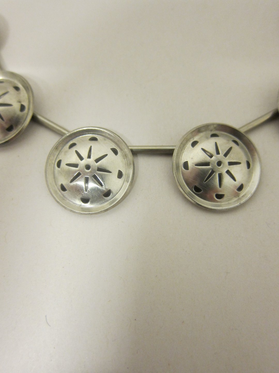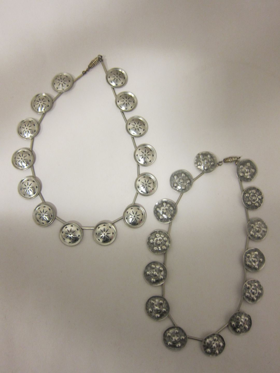 Halskæde, leddelt, af Tin Vintage smykker (halskæden til højre er solgt) Stemplet: Jørgen Jensen Denmark Pewter Handmade Design: Jørgen Jensen Vi har et bredt udvalg af tinsmykker Kontakt os for yderligere information Varenr.: 5154